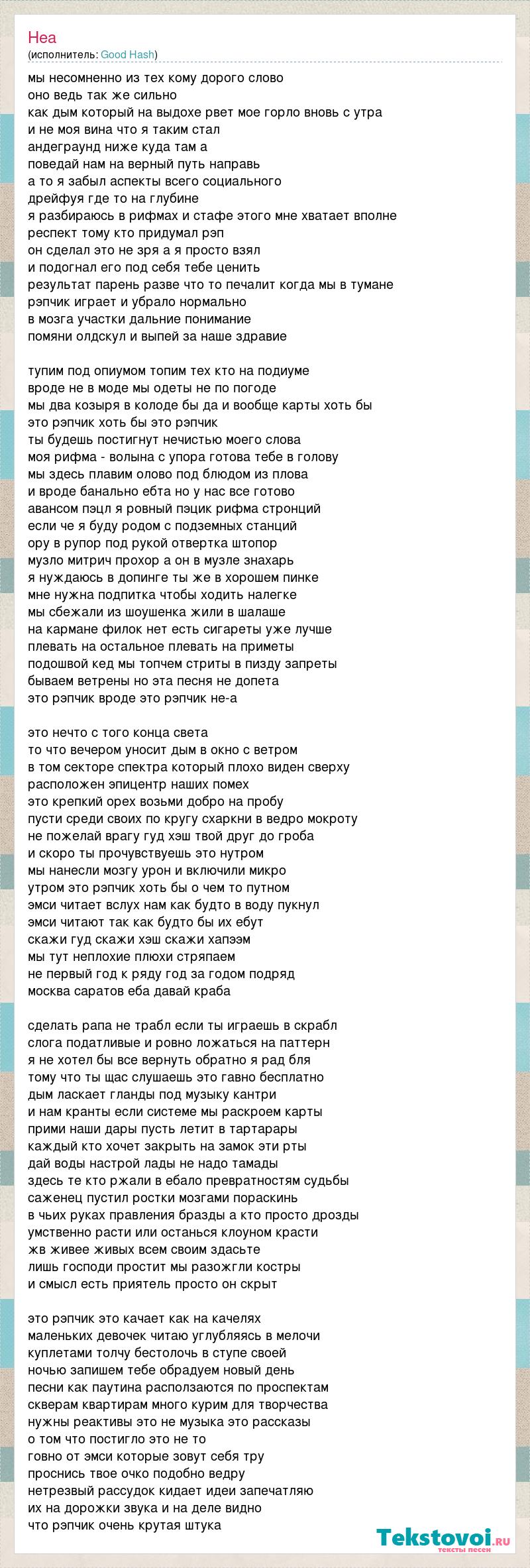 мы несомненно из тех кому дорого слово оно ведь так же сильно как дым который на выдохе рвет мое горло вновь с утра и не моя вина что я таким стал андеграунд ниже куда там а поведай нам на верный путь направь а то я забыл аспекты всего социального дрейфуя где то на глубине я разбираюсь в рифмах и стафе этого мне хватает вполне респект тому кто придумал рэп он сделал это не зря а я просто взял и подогнал его под себя тебе ценить результат парень разве что то печалит когда мы в тумане рэпчик играет и убрало нормально в мозга участки дальние понимание помяни олдскул и выпей за наше здравие тупим под опиумом топим тех кто на подиуме вроде не в моде мы одеты не по погоде мы два козыря в колоде бы да и вообще карты хоть бы это рэпчик хоть бы это рэпчик ты будешь постигнут нечистью моего слова моя рифма - волына с упора готова тебе в голову мы здесь плавим олово под блюдом из плова и вроде банально ебта но у нас все готово авансом пэцл я ровный пэцик рифма стронций если че я буду родом с подземных станций ору в рупор под рукой отвертка штопор музло митрич прохор а он в музле знахарь я нуждаюсь в допинге ты же в хорошем пинке мне нужна подпитка чтобы ходить налегке мы сбежали из шоушенка жили в шалаше на кармане филок нет есть сигареты уже лучше плевать на остальное плевать на приметы подошвой кед мы топчем стриты в пизду запреты бываем ветрены но эта песня не допета это рэпчик вроде это рэпчик не-а это нечто с того конца света то что вечером уносит дым в окно с ветром в том секторе спектра который плохо виден сверху расположен эпицентр наших помех это крепкий орех возьми добро на пробу пусти среди своих по кругу схаркни в ведро мокроту не пожелай врагу гуд хэш твой друг до гроба и скоро ты прочувствуешь это нутром мы нанесли мозгу урон и включили микро утром это рэпчик хоть бы о чем то путном эмси читает вслух нам как будто в воду пукнул эмси читают так как будто бы их ебут скажи гуд скажи хэш скажи хапээм мы тут неплохие плюхи стряпаем не первый год к ряду год за годом подряд москва саратов еба давай краба сделать рапа не трабл если ты играешь в скрабл слога податливые и ровно ложаться на паттерн я не хотел бы все вернуть обратно я рад бля тому что ты щас слушаешь это гавно бесплатно дым ласкает гланды под музыку кантри и нам кранты если системе мы раскроем карты прими наши дары пусть летит в тартарары каждый кто хочет закрыть на замок эти рты дай воды настрой лады не надо тамады здесь те кто ржали в ебало превратностям судьбы саженец пустил ростки мозгами пораскинь в чьих руках правления бразды а кто просто дрозды умственно расти или останься клоуном красти жв живее живых всем своим здасьте лишь господи простит мы разожгли костры и смысл есть приятель просто он скрыт это рэпчик это качает как на качелях маленьких девочек читаю углубляясь в мелочи куплетами толчу бестолочь в ступе своей ночью запишем тебе обрадуем новый день песни как паутина расползаются по проспектам скверам квартирам много курим для творчества нужны реактивы это не музыка это рассказы о том что постигло это не то говно от эмси которые зовут себя тру проснись твое очко подобно ведру нетрезвый рассудок кидает идеи запечатляю их на дорожки звука и на деле видно что рэпчик очень крутая штука