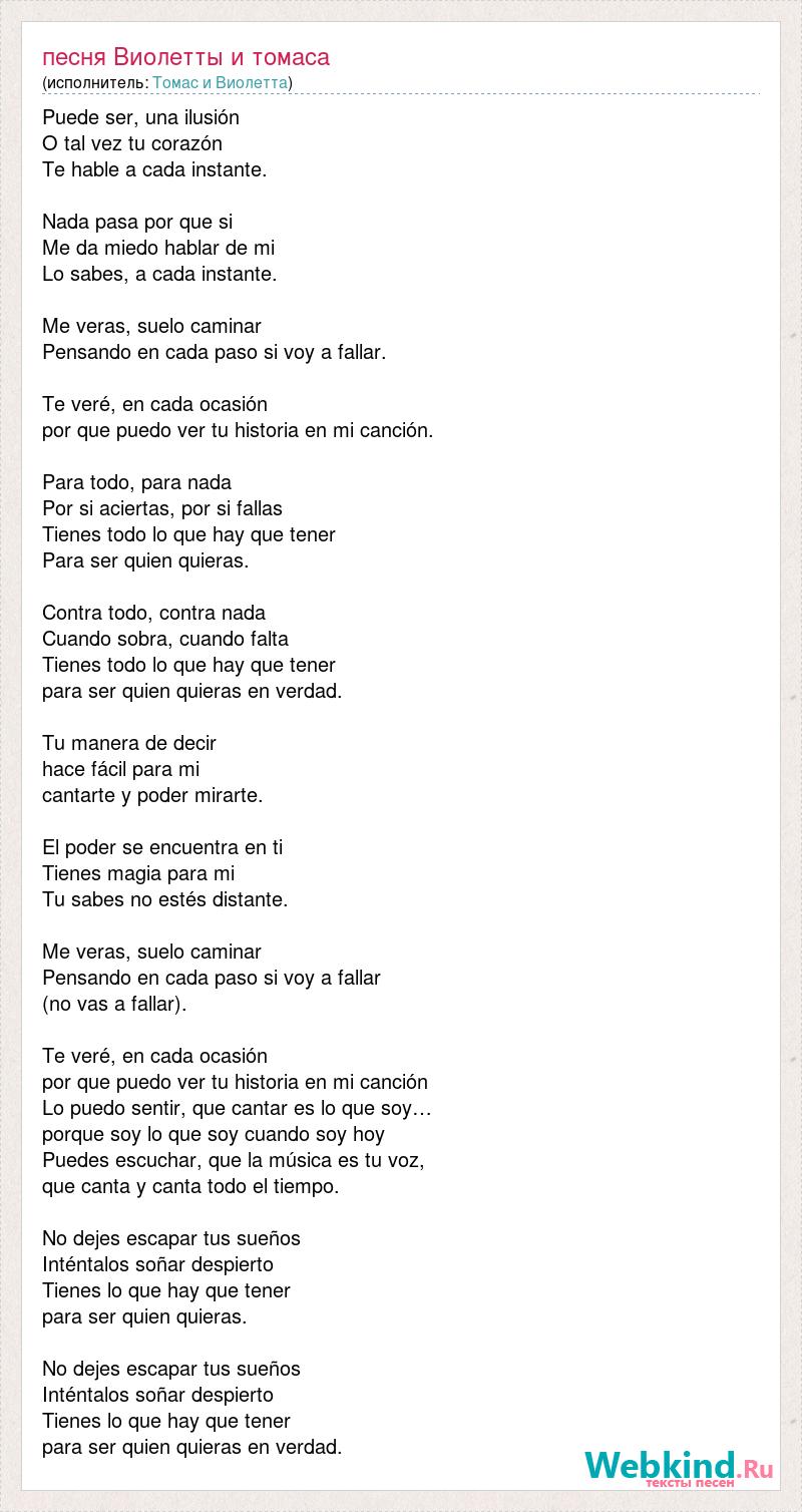 Puede ser, una ilusión O tal vez tu corazón Te hable a cada instante. Nada pasa por que si Me da miedo hablar de mi Lo sabes, a cada instante. Me veras, suelo caminar Pensando en cada paso si voy a fallar. Te veré, en cada ocasión por que puedo ver tu historia en mi canción. Para todo, para nada Por si aciertas, por si fallas Tienes todo lo que hay que tener Para ser quien quieras. Contra todo, contra nada Cuando sobra, cuando falta Tienes todo lo que hay que tener para ser quien quieras en verdad. Tu manera de decir hace fácil para mi cantarte y poder mirarte. El poder se encuentra en ti Tienes magia para mi Tu sabes no estés distante. Me veras, suelo caminar Pensando en cada paso si voy a fallar (no vas a fallar). Te veré, en cada ocasión por que puedo ver tu historia en mi canción Lo puedo sentir, que cantar es lo que soy… porque soy lo que soy cuando soy hoy Puedes escuchar, que la música es tu voz, que canta y canta todo el tiempo. No dejes escapar tus sueños Inténtalos soñar despierto Tienes lo que hay que tener para ser quien quieras. No dejes escapar tus sueños Inténtalos soñar despierto Tienes lo que hay que tener para ser quien quieras en verdad.