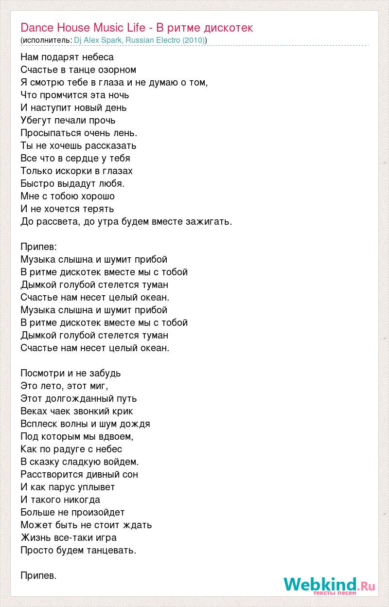 Нам подарят небеса Счастье в танце озорном Я смотрю тебе в глаза и не думаю о том, Что промчится эта ночь И наступит новый день Убегут печали прочь Просыпаться очень лень. Ты не хочешь рассказать Все что в сердце у тебя Только искорки в глазах Быстро выдадут любя. Мне с тобою хорошо И не хочется терять До рассвета, до утра будем вместе зажигать. Припев: Музыка слышна и шумит прибой В ритме дискотек вместе мы с тобой Дымкой голубой стелется туман Счастье нам несет целый океан. Музыка слышна и шумит прибой В ритме дискотек вместе мы с тобой Дымкой голубой стелется туман Счастье нам несет целый океан. Посмотри и не забудь Это лето, этот миг, Этот долгожданный путь Веках чаек звонкий крик Всплеск волны и шум дождя Под которым мы вдвоем, Как по радуге с небес В сказку сладкую войдем. Расстворится дивный сон И как парус уплывет И такого никогда Больше не произойдет Может быть не стоит ждать Жизнь все-таки игра Просто будем танцевать. Припев.