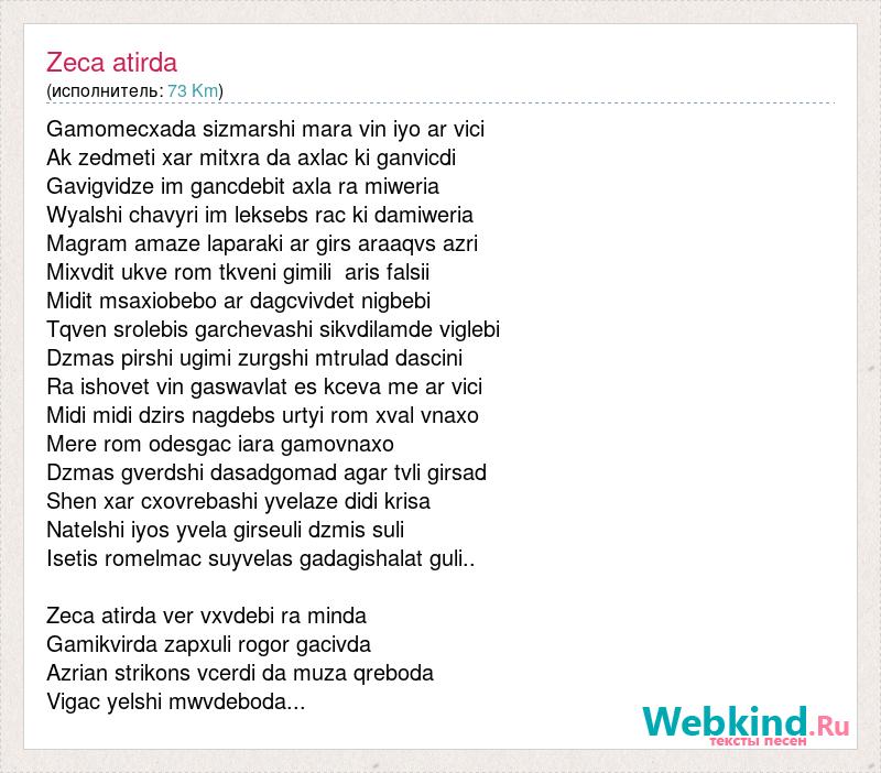 Gamomecxada sizmarshi mara vin iyo ar vici Ak zedmeti xar mitxra da axlac ki ganvicdi Gavigvidze im gancdebit axla ra miweria Wyalshi chavyri im leksebs rac ki damiweria Magram amaze laparaki ar girs araaqvs azri Mixvdit ukve rom tkveni gimili aris falsii Midit msaxiobebo ar dagcvivdet nigbebi Tqven srolebis garchevashi sikvdilamde viglebi Dzmas pirshi ugimi zurgshi mtrulad dascini Ra ishovet vin gaswavlat es kceva me ar vici Midi midi dzirs nagdebs urtyi rom xval vnaxo Mere rom odesgac iara gamovnaxo Dzmas gverdshi dasadgomad agar tvli girsad Shen xar cxovrebashi yvelaze didi krisa Natelshi iyos yvela girseuli dzmis suli Isetis romelmac suyvelas gadagishalat guli.. Zeca atirda ver vxvdebi ra minda Gamikvirda zapxuli rogor gacivda Azrian strikons vcerdi da muza qreboda Vigac yelshi mwvdeboda...