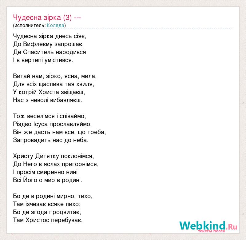 Чудесна зірка днесь сіяє, До Вифлеєму запрошає, Де Спаситель народився І в вертепі умістився. Витай нам, зірко, ясна, мила, Для всіх щаслива тая хвиля, У котрій Христа звіщаєш, Нас з неволі вибавляєш. Тож веселімся і співаймо, Різдво Ісуса прославляймо, Він же дасть нам все, що треба, Запровадить нас до неба. Христу Дитятку поклонімся, До Него в яслах пригорнімся, І просім смиренно нині Всі Його о мир в родині. Бо де в родині мирно, тихо, Там ізчезає всяке лихо; Бо де згода процвитає, Там Христос перебуває.