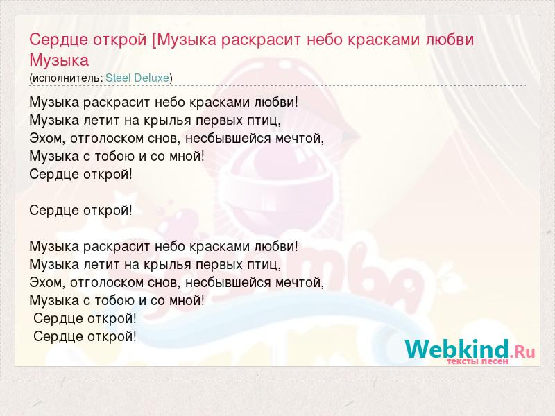 Главная→Исполнители→Steel Deluxe→Сердце открой [Музыка раскрасит небо красками любви Музыка летит на крыльях белы