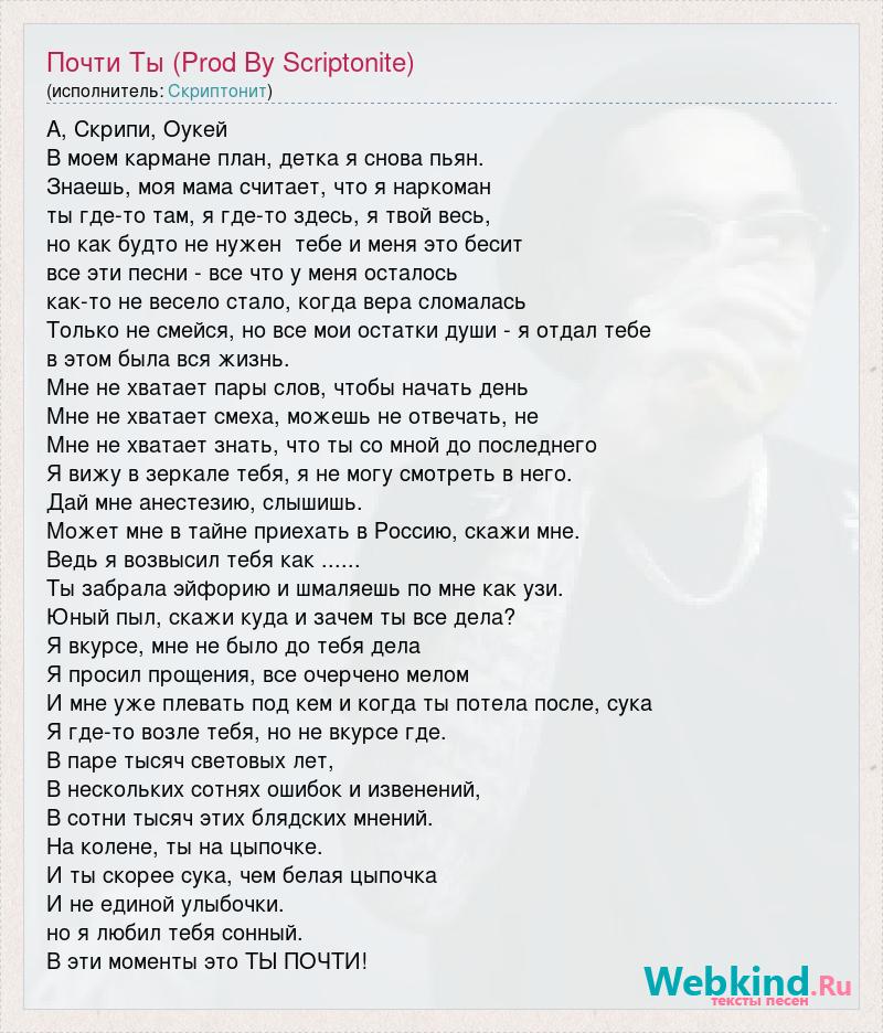 А, Скрипи, Оукей В моем кармане план, детка я снова пьян. Знаешь, моя мама считает, что я наркоман ты где-то там, я где-то здесь, я твой весь, но как будто не нужен тебе и меня это бесит все эти песни - все что у меня осталось как-то не весело стало, когда вера сломалась Только не смейся, но все мои остатки души - я отдал тебе в этом была вся жизнь. Мне не хватает пары слов, чтобы начать день Мне не хватает смеха, можешь не отвечать, не Мне не хватает знать, что ты со мной до последнего Я вижу в зеркале тебя, я не могу смотреть в него. Дай мне анестезию, слышишь. Может мне в тайне приехать в Россию, скажи мне. Ведь я возвысил тебя как ...... Ты забрала эйфорию и шмаляешь по мне как узи. Юный пыл, скажи куда и зачем ты все дела? Я вкурсе, мне не было до тебя дела Я просил прощения, все очерчено мелом И мне уже плевать под кем и когда ты потела после, сука Я где-то возле тебя, но не вкурсе где. В паре тысяч световых лет, В нескольких сотнях ошибок и извенений, В сотни тысяч этих блядских мнений. На колене, ты на цыпочке. И ты скорее сука, чем белая цыпочка И не единой улыбочки. но я любил тебя сонный. В эти моменты это ТЫ ПОЧТИ!