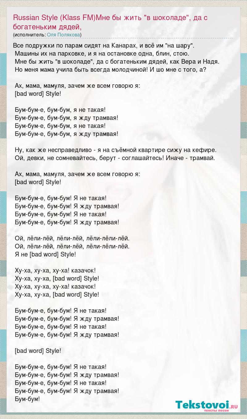 Главная→Исполнители→Оля Полякова→Russian Style (Klass FM)Мне бы жить "в шоколаде", да с богатеньким дядей