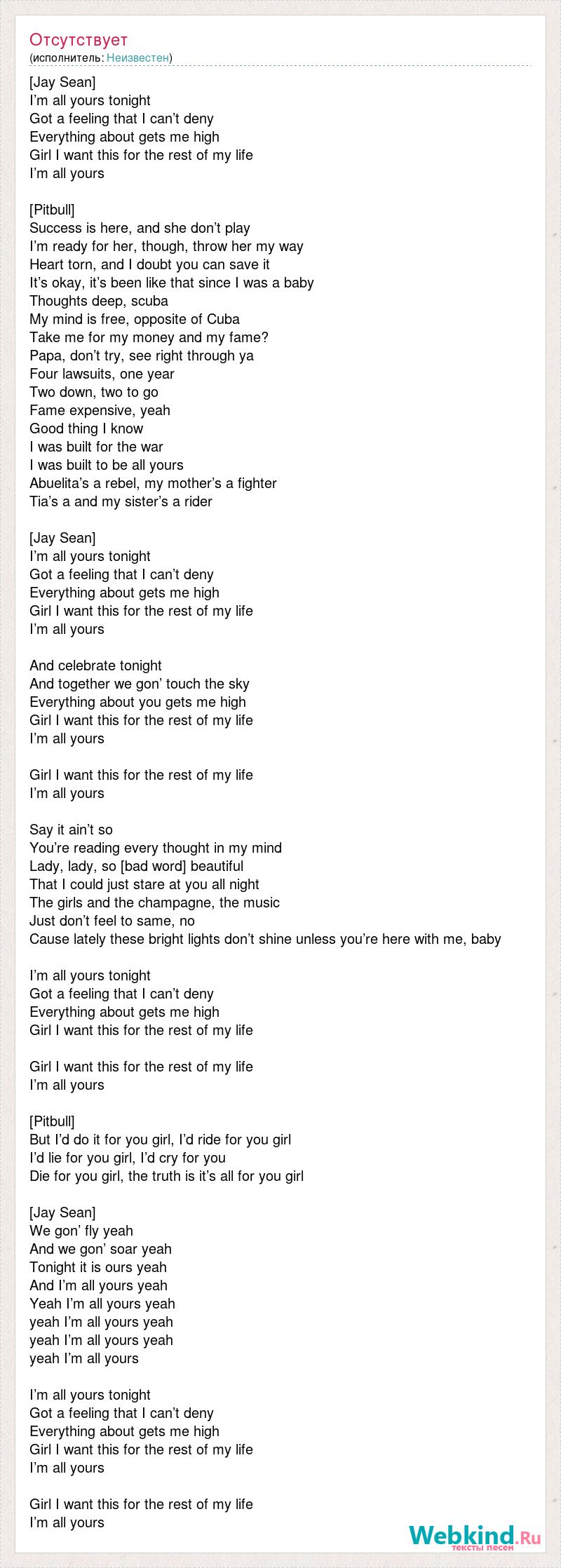 [Jay Sean] I’m all yours tonight Got a feeling that I can’t deny Everything about gets me high Girl I want this for the rest of my life I’m all yours [Pitbull] Success is here, and she don’t play I’m ready for her, though, throw her my way Heart torn, and I doubt you can save it It’s okay, it’s been like that since I was a baby Thoughts deep, scuba My mind is free, opposite of Cuba Take me for my money and my fame? Papa, don’t try, see right through ya Four lawsuits, one year Two down, two to go Fame expensive, yeah Good thing I know I was built for the war I was built to be all yours Abuelita’s a rebel, my mother’s a fighter Tia’s a and my sister’s a rider [Jay Sean] I’m all yours tonight Got a feeling that I can’t deny Everything about gets me high Girl I want this for the rest of my life I’m all yours And celebrate tonight And together we gon’ touch the sky Everything about you gets me high Girl I want this for the rest of my life I’m all yours Girl I want this for the rest of my life I’m all yours Say it ain’t so You’re reading every thought in my mind Lady, lady, so [bad word] beautiful That I could just stare at you all night The girls and the champagne, the music Just don’t feel to same, no Cause lately these bright lights don’t shine unless you’re here with me, baby I’m all yours tonight Got a feeling that I can’t deny Everything about gets me high Girl I want this for the rest of my life Girl I want this for the rest of my life I’m all yours [Pitbull] But I’d do it for you girl, I’d ride for you girl I’d lie for you girl, I’d cry for you Die for you girl, the truth is it’s all for you girl [Jay Sean] We gon’ fly yeah And we gon’ soar yeah Tonight it is ours yeah And I’m all yours yeah Yeah I’m all yours yeah yeah I’m all yours yeah yeah I’m all yours yeah yeah I’m all yours I’m all yours tonight Got a feeling that I can’t deny Everything about gets me high Girl I want this for the rest of my life I’m all yours Girl I want this for the rest of my life I’m all yours