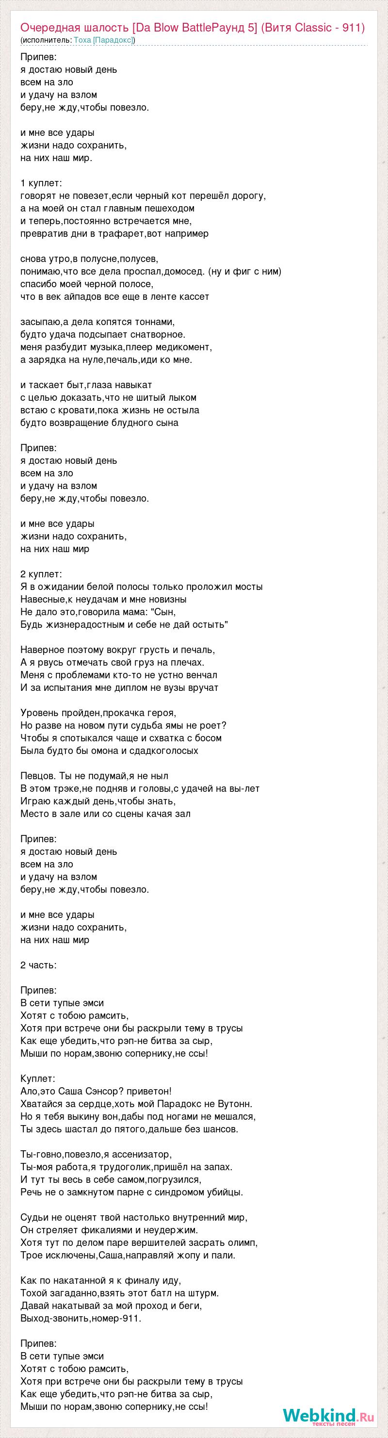 Припев: я достаю новый день всем на зло и удачу на взлом беру,не жду,чтобы повезло. и мне все удары жизни надо сохранить, на них наш мир. 1 куплет: говорят не повезет,если черный кот перешёл дорогу, а на моей он стал главным пешеходом и теперь,постоянно встречается мне, превратив дни в трафарет,вот например снова утро,в полусне,полусев, понимаю,что все дела проспал,домосед. (ну и фиг с ним) спасибо моей черной полосе, что в век айпадов все еще в ленте кассет засыпаю,а дела копятся тоннами, будто удача подсыпает снатворное. меня разбудит музыка,плеер медикомент, а зарядка на нуле,печаль,иди ко мне. и таскает быт,глаза навыкат с целью доказать,что не шитый лыком встаю с кровати,пока жизнь не остыла будто возвращение блудного сына Припев: я достаю новый день всем на зло и удачу на взлом беру,не жду,чтобы повезло. и мне все удары жизни надо сохранить, на них наш мир 2 куплет: Я в ожидании белой полосы только проложил мосты Навесные,к неудачам и мне новизны Не дало это,говорила мама: "Сын, Будь жизнерадостным и себе не дай остыть" Наверное поэтому вокруг грусть и печаль, А я рвусь отмечать свой груз на плечах. Меня с проблемами кто-то не устно венчал И за испытания мне диплом не вузы вручат Уровень пройден,прокачка героя, Но разве на новом пути судьба ямы не роет? Чтобы я спотыкался чаще и схватка с босом Была будто бы омона и сдадкоголосых Певцов. Ты не подумай,я не ныл В этом трэке,не подняв и головы,с удачей на вы-лет Играю каждый день,чтобы знать, Место в зале или со сцены качая зал Припев: я достаю новый день всем на зло и удачу на взлом беру,не жду,чтобы повезло. и мне все удары жизни надо сохранить, на них наш мир 2 часть: Припев: В сети тупые эмси Хотят с тобою рамсить, Хотя при встрече они бы раскрыли тему в трусы Как еще убедить,что рэп-не битва за сыр, Мыши по норам,звоню сопернику,не ссы! Куплет: Ало,это Саша Сэнсор? приветон! Хватайся за сердце,хоть мой Парадокс не Вутонн. Но я тебя выкину вон,дабы под ногами не мешался, Ты здесь шастал до пятого,дальше без шансов. Ты-говно,повезло,я ассенизатор, Ты-моя работа,я трудоголик,пришёл на запах. И тут ты весь в себе самом,погрузился, Речь не о замкнутом парне с синдромом убийцы. Судьи не оценят твой настолько внутренний мир, Он стреляет фикалиями и неудержим. Хотя тут по делом паре вершителей засрать олимп, Трое исключены,Саша,направляй жопу и пали. Как по накатанной я к финалу иду, Тохой загаданно,взять этот батл на штурм. Давай накатывай за мой проход и беги, Выход-звонить,номер-911. Припев: В сети тупые эмси Хотят с тобою рамсить, Хотя при встрече они бы раскрыли тему в трусы Как еще убедить,что рэп-не битва за сыр, Мыши по норам,звоню сопернику,не ссы!
