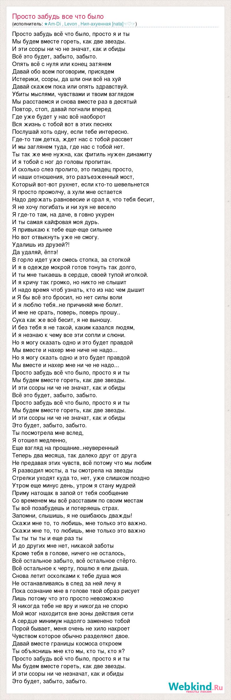 Просто забудь всё что было, просто я и ты Мы будем вместе гореть, как две звезды. И эти ссоры ни чо не значат, как и обиды Всё это будет, забыто, забыто. Опять всё с нуля или конец затянем Давай обо всем поговорим, присядем Истерики, ссоры, да шли они всё на хуй Давай скажем пока или опять здравствуй. Убиты мыслями, чувствами и твоим взглядом Мы расстаемся и снова вместе раз в десятый Повтор, стоп, давай погнали вперед Где уже будет у нас всё наоборот Вся жизнь с тобой вот в этих песнях Послушай хоть одну, если тебе интересно. Где-то там детка, ждет нас с тобой рассвет И мы заглянем туда, где нас с тобой нет. Ты так же мне нужна, как фитиль нужен динамиту И я тобой с ног до головы пропитан. И сколько слез пролито, это пиздец просто, И наши отношения, это разъезженный мост, Который вот-вот рухнет, если кто-то шевельнется Я просто промолчу, а хули мне остается Надо держать равновесие и срал я, что тебя бесит, Я не хочу погибать и ни хуя не весело Я где-то там, на даче, в говно укурен И ты самая кайфовая моя дурь. Я привыкаю к тебе еще-еще сильнее Но вот отвыкнуть уже не смогу. Удалишь из друзей?! Да удаляй, ёптэ! В горло идет уже смесь стопка, за стопкой И я в одежде мокрой готов тонуть так долго, И ты мне тыкаешь в сердце, своей тупой иголкой. И я кричу так громко, но никто не слышит И надо время чтоб узнать, кто из нас чем дышит и Я бы всё это бросил, но нет силы воли И я люблю тебя..не причиняй мне болит. И мне не срать, поверь, поверь прошу.. Сука как же всё бесит, я не выношу. И без тебя я не такой, каким казался людям, И я незнаю к чему все эти сопли и слюни. Но я могу сказать одно и это будет правдой Мы вместе и нахер мне ниче не надо... Но я могу сказть одно и это будет правдой Мы вместе и нахер мне ни че не надо... Просто забудь всё что было, просто я и ты Мы будем вместе гореть, как две звезды. И эти ссоры ни че не значат, как и обиды Всё это будет, забыто, забыто. Просто забудь всё что было, просто я и ты Мы будем вместе гореть, как две звезды. И эти ссоры ни че не значат, как и обиды Это будет, забыто, забыто. Ты посмотрела мне вслед, Я отошел медленно, Еще взгляд на прощание..неуверенный Теперь два месяца, так далеко друг от друга Не предавая этих чувств, всё потому что мы любим Я разводил мосты, а ты смотрела на звезды Стрелки уходят куда то, нет, уже слишком поздно Утром еще минус день, утром я стану мудрей Приму натощак в запой от тебя сообщение Со временем мы всё расставим по своим местам Ты всё позабудешь и потеряешь страх. Запомни, слышишь, я не ошибаюсь дважды! Скажи мне то, то любишь, мне только это важно. Скажи мне то, то любишь, мне только это важно Ты ты ты ты и еще раз ты И до других мне нет, никакой заботы Кроме тебя в голове, ничего не осталось, Всё остальное забыто, всё остальное стёрто. Всё остальное к черту, пошлю я ели дыша. Снова летит осколками к тебе душа моя Не останавливаясь в след за ней лечу я Пока сознание мне в голове твой образ рисует Лишь потому что это просто невозможно Я никогда тебе не вру и никогда не спорю Мой мозг находится вне зоны действия сети А сердце минимум надолго заменено тобой Порой бывает, меня очень не хило накроет Чувством которое обычно разделяют двое. Давай вместе границы космоса откроем Ты объяснишь мне кто мы, кто ты, кто я? Просто забудь всё что было, просто я и ты Мы будем вместе гореть, как две звезды. И эти ссоры ни че незначат, как и обиды Это буде