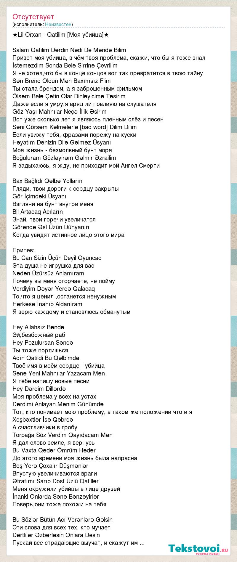 ★Lil Orxan - Qatilim [Моя убийца]★ Salam Qatilim Dərdin Nədi De Məndə Bilim Привет моя убийца, в чём твоя проблема, скажи, что бы я тоже знал İstəməzdim Sonda Belə Sirrinə Çevrilim Я не хотел,что бы в конце концов вот так превратится в твою тайну Sən Brend Oldun Mən Baxımsız Flim Ты стала брендом, а я заброшенным фильмом Ölsəm Belə Çətin Olar Dinləyicimə Təsirim Даже если я умру,я вряд ли повлияю на слушателя Göz Yaşı Mahnılar Neçə İllik Əsirim Вот уже сколько лет я являюсь пленным слёз и песен Səni Görsəm Kəlmələrlə Doğruyaram Dilim Dilim Если увижу тебя, фразами порежу на куски Həyatım Dənizin Dilə Gəlməz Üsyanı Моя жизнь - безмолвный бунт моря Boğuluram Gözləyirəm Gəlmir Əzrailim Я задыхаюсь, я жду, не приходит мой Ангел Смерти Bax Bağlıdı Qəlbə Yolların Гляди, твои дороги к сердцу закрыты Gör İçimdəki Üsyanı Взгляни на бунт внутри меня Bil Artacaq Acıların Знай, твои горечи увеличатся Görəndə Əsl Üzün Dünyanın Когда увидят истинное лицо этого мира Припев: Bu Can Sizin Üçün Deyil Oyuncaq Эта душа не игрушка для вас Nədən Üzürsüz Anlamıram Почему вы меня огорчаете, не пойму Verdiyim Dəyər Yerdə Qalacaq То,что я ценил ,останется ненужным Hərkəsə İnanıb Aldanıram Я верю каждому и становлюсь обманутым Hey Allahsız Bəndə Эй,безбожный раб Hey Pozulursan Səndə Ты тоже портишься Adın Qatildi Bu Qəlbimdə Твоё имя в моём сердце - убийца Sənə Yeni Mahnılar Yazacam Mən Я тебе напишу новые песни Hey Dərdim Dillərdə Моя проблема у всех на устах Dərdimi Anlayan Mənim Günümdə Тот, кто понимает мою проблему, в таком же положении что и я Xoşbəxtlər İsə Qəbrdə А счастливчики в гробу Torpağa Söz Verdim Qayıdacam Mən Я дал слово земле, я вернусь Bu Vaxta Qədər Ömrüm Hədər До этого времени моя жизнь была напрасна Boş Yerə Çoxalır Düşmənlər Впустую увеличиваются враги Ətrafımı Sarıb Dost Üzlü Qatillər Меня окружили убийцы в лице друзей İnanki Onlarda Sənə Bənzəyirlər Поверь,они тоже похожи на тебя Bu Sözlər Bütün Acı Verənlərə Gəlsin Эти слова для всех тех, кто мучает Dərtlilər Əzbərləsin Onlara Desin Пускай все страдающие выучат, и скажут им ...