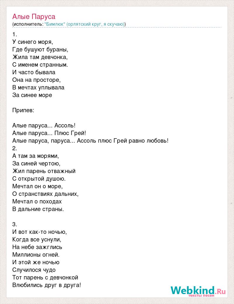 1. У синего моря, Где бушуют бураны, Жила там девчонка, С именем странным. И часто бывала Она на просторе, В мечтах уплывала За синее море Припев: Алые паруса... Ассоль! Алые паруса... Плюс Грей! Алые паруса, паруса... Ассоль плюс Грей равно любовь! 2. А там за морями, За синей чертою, Жил парень отважный С открытой душою. Мечтал он о море, О странствиях дальних, Мечтал о походах В дальние страны. 3. И вот как-то ночью, Когда все уснули, На небе зажглись Миллионы огней. И этой же ночью Случилося чудо Тот парень с девчонкой Влюбились друг в друга!