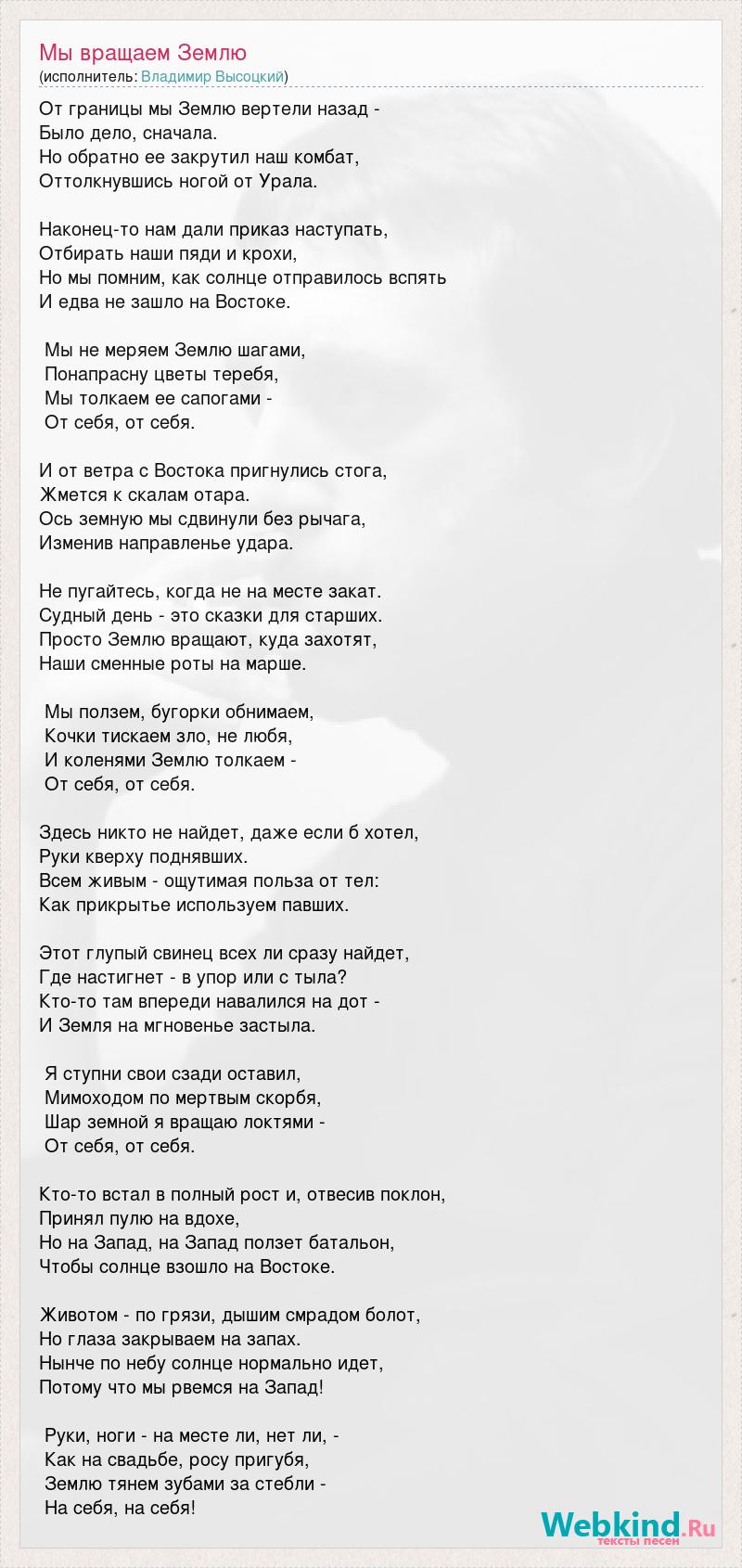 От границы мы Землю вертели назад - Было дело, сначала. Но обратно ее закрутил наш комбат, Оттолкнувшись ногой от Урала. Наконец-то нам дали приказ наступать, Отбирать наши пяди и крохи, Но мы помним, как солнце отправилось вспять И едва не зашло на Востоке. Мы не меряем Землю шагами, Понапрасну цветы теребя, Мы толкаем ее сапогами - От себя, от себя. И от ветра с Востока пригнулись стога, Жмется к скалам отара. Ось земную мы сдвинули без рычага, Изменив направленье удара. Не пугайтесь, когда не на месте закат. Судный день - это сказки для старших. Просто Землю вращают, куда захотят, Наши сменные роты на марше. Мы ползем, бугорки обнимаем, Кочки тискаем зло, не любя, И коленями Землю толкаем - От себя, от себя. Здесь никто не найдет, даже если б хотел, Руки кверху поднявших. Всем живым - ощутимая польза от тел: Как прикрытье используем павших. Этот глупый свинец всех ли сразу найдет, Где настигнет - в упор или с тыла? Кто-то там впереди навалился на дот - И Земля на мгновенье застыла. Я ступни свои сзади оставил, Мимоходом по мертвым скорбя, Шар земной я вращаю локтями - От себя, от себя. Кто-то встал в полный рост и, отвесив поклон, Принял пулю на вдохе, Но на Запад, на Запад ползет батальон, Чтобы солнце взошло на Востоке. Животом - по грязи, дышим смрадом болот, Но глаза закрываем на запах. Нынче по небу солнце нормально идет, Потому что мы рвемся на Запад! Руки, ноги - на месте ли, нет ли, - Как на свадьбе, росу пригубя, Землю тянем зубами за стебли - На себя, на себя!