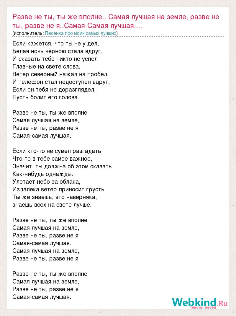 Если кажется, что ты не у дел, Белая ночь чёрною стала вдруг, И сказать тебе никто не успел Главные на свете слова. Ветер северный нажал на пробел, И телефон стал недоступен вдруг, Если он тебя не доразглядел, Пусть болит его голова. Разве не ты, ты же вполне Самая лучшая на земле, Разве не ты, разве не я Самая-самая лучшая. Если кто-то не сумел разгадать Что-то в тебе самое важное, Значит, ты должна об этом сказать Как-нибудь однажды. Улетает небо за облака, Издалека ветер приносит грусть Ты же знаешь, это наверняка, знаешь всех на свете лучше. Разве не ты, ты же вполне Самая лучшая на земле, Разве не ты, разве не я Самая-самая лучшая. Самая лучшая на земле, Разве не ты, разве не я Разве не ты, ты же вполне Самая лучшая на земле, Разве не ты, разве не я Самая-самая лучшая.