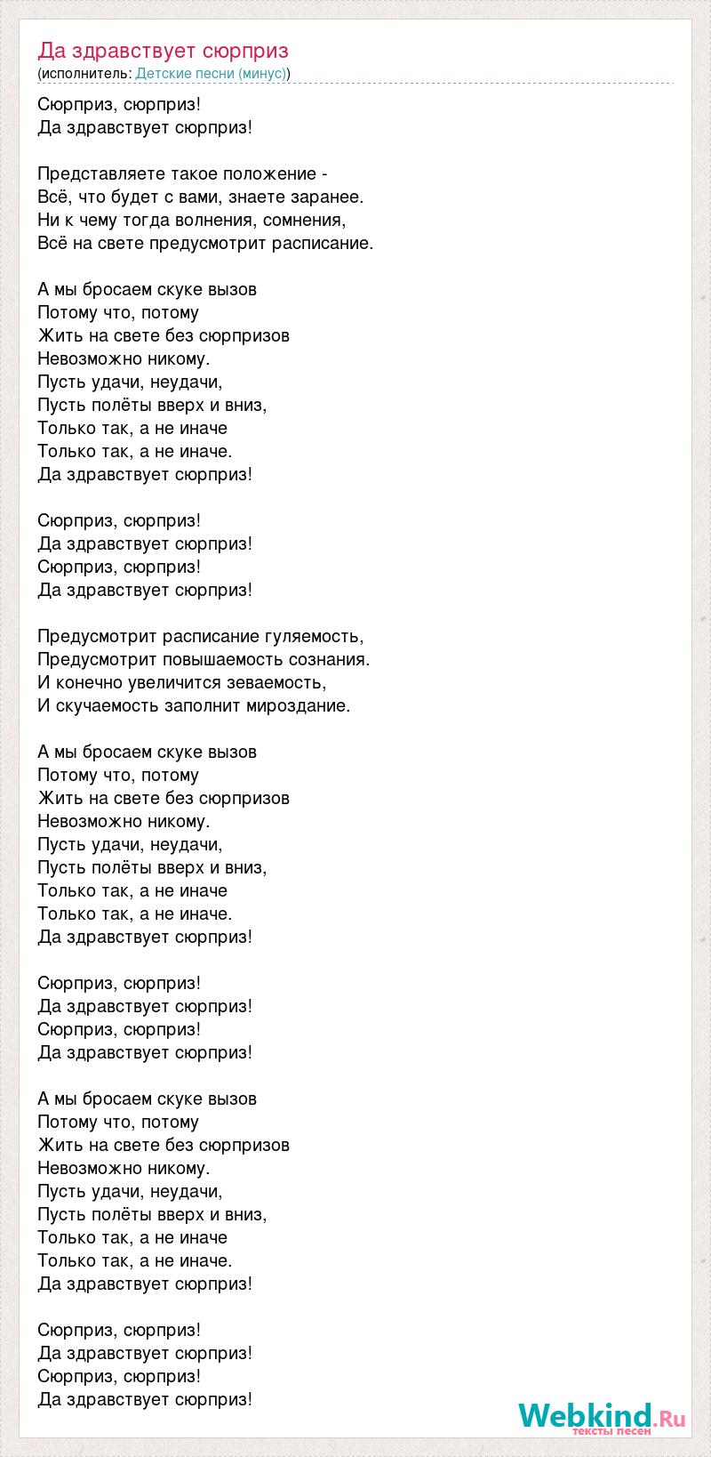 Сюрприз, сюрприз! Да здравствует сюрприз! Представляете такое положение - Всё, что будет с вами, знаете заранее. Ни к чему тогда волнения, сомнения, Всё на свете предусмотрит расписание. А мы бросаем скуке вызов Потому что, потому Жить на свете без сюрпризов Невозможно никому. Пусть удачи, неудачи, Пусть полёты вверх и вниз, Только так, а не иначе Только так, а не иначе. Да здравствует сюрприз! Сюрприз, сюрприз! Да здравствует сюрприз! Сюрприз, сюрприз! Да здравствует сюрприз! Предусмотрит расписание гуляемость, Предусмотрит повышаемость сознания. И конечно увеличится зеваемость, И скучаемость заполнит мироздание. А мы бросаем скуке вызов Потому что, потому Жить на свете без сюрпризов Невозможно никому. Пусть удачи, неудачи, Пусть полёты вверх и вниз, Только так, а не иначе Только так, а не иначе. Да здравствует сюрприз! Сюрприз, сюрприз! Да здравствует сюрприз! Сюрприз, сюрприз! Да здравствует сюрприз! А мы бросаем скуке вызов Потому что, потому Жить на свете без сюрпризов Невозможно никому. Пусть удачи, неудачи, Пусть полёты вверх и вниз, Только так, а не иначе Только так, а не иначе. Да здравствует сюрприз! Сюрприз, сюрприз! Да здравствует сюрприз! Сюрприз, сюрприз! Да здравствует сюрприз!