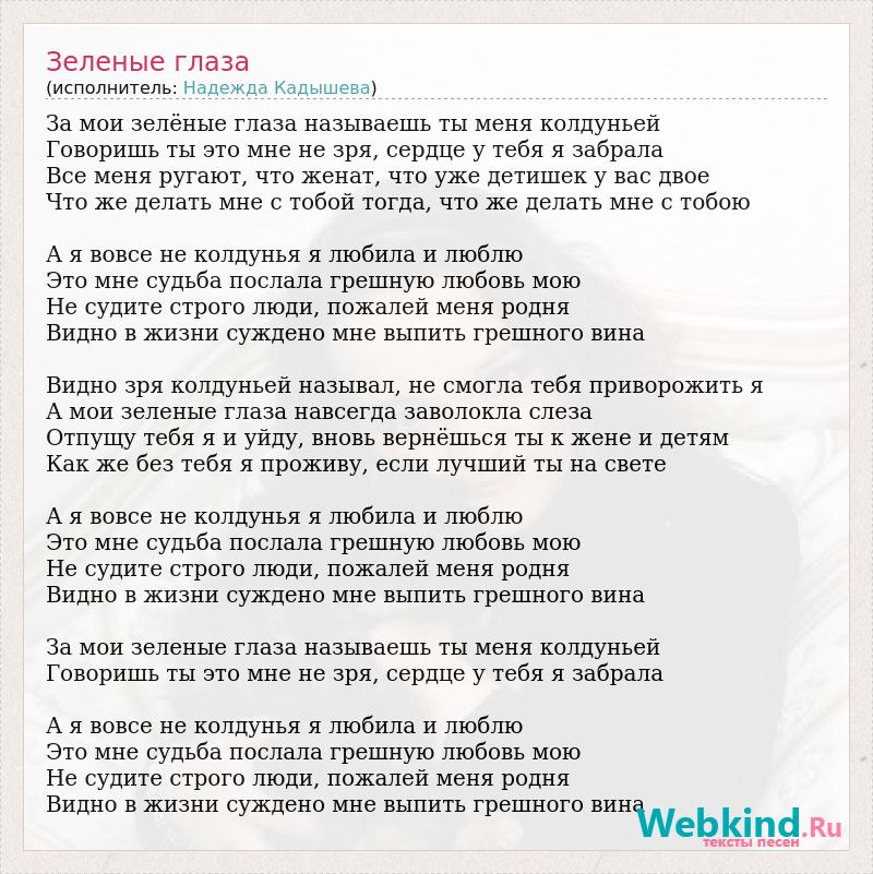 За мои зелёные глаза называешь ты меня колдуньей Говоришь ты это мне не зря, сердце у тебя я забрала Все меня ругают, что женат, что уже детишек у вас двое Что же делать мне с тобой тогда, что же делать мне с тобою А я вовсе не колдунья я любила и люблю Это мне судьба послала грешную любовь мою Не судите строго люди, пожалей меня родня Видно в жизни суждено мне выпить грешного вина Видно зря колдуньей называл, не смогла тебя приворожить я А мои зеленые глаза навсегда заволокла слеза Отпущу тебя я и уйду, вновь вернёшься ты к жене и детям Как же без тебя я проживу, если лучший ты на свете А я вовсе не колдунья я любила и люблю Это мне судьба послала грешную любовь мою Не судите строго люди, пожалей меня родня Видно в жизни суждено мне выпить грешного вина За мои зеленые глаза называешь ты меня колдуньей Говоришь ты это мне не зря, сердце у тебя я забрала А я вовсе не колдунья я любила и люблю Это мне судьба послала грешную любовь мою Не судите строго люди, пожалей меня родня Видно в жизни суждено мне выпить грешного вина