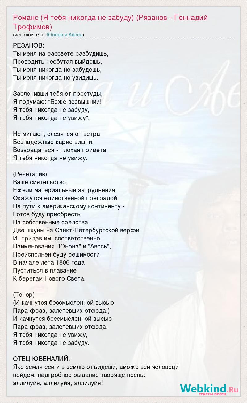 РЕЗАНОВ: Ты меня на рассвете разбудишь, Проводить необутая выйдешь, Ты меня никогда не забудешь, Ты меня никогда не увидишь. Заслонивши тебя от простуды, Я подумаю: "Боже всевышний! Я тебя никогда не забуду, Я тебя никогда не увижу". Не мигают, слезятся от ветра Безнадежные карие вишни. Возвращаться - плохая примета, Я тебя никогда не увижу. (Речетатив) Ваше сиятельство, Ежели материальные затруднения Окажутся единственной преградой На пути к американскому континенту - Готов буду приобресть На собственные средства Две шхуны на Санкт-Петербургской верфи И, придав им, соответственно, Наименования "Юнона" и "Авось", Преисполнен буду решимости В начале лета 1806 года Пуститься в плавание К берегам Нового Света. (Тенор) (И качнутся бессмысленной высью Пара фраз, залетевших отсюда.) И качнутся бессмысленной высью Пара фраз, залетевших отсюда. Я тебя никогда не увижу, Я тебя никогда не забуду. ОТЕЦ ЮВЕНАЛИЙ: Яко земля еси и в землю отъидеши, аможе вси человеци пойдем, надгробное рыдание творяще песнь: аллилуйя, аллилуйя, аллилуйя!