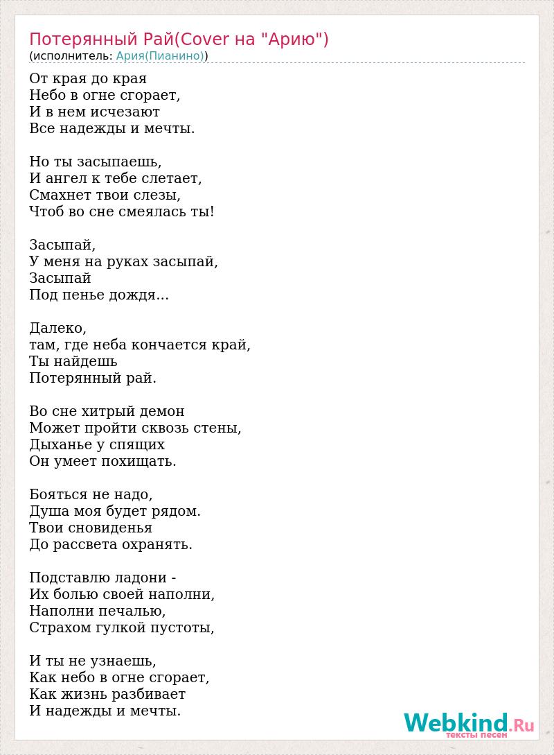 От края до края Небо в огне сгорает, И в нем исчезают Все надежды и мечты. Но ты засыпаешь, И ангел к тебе слетает, Смахнет твои слезы, Чтоб во сне смеялась ты! 3асыпай, У меня на руках засыпай, Засыпай Под пенье дождя... Далеко, там, где неба кончается край, Ты найдешь Потерянный рай. Во сне хитрый демон Может пройти сквозь стены, Дыханье у спящих Он умеет похищать. Бояться не надо, Душа моя будет рядом. Твои сновиденья До рассвета охранять. Подставлю ладони - Их болью своей наполни, Наполни печалью, Страхом гулкой пустоты, И ты не узнаешь, Как небо в огне сгорает, Как жизнь разбивает И надежды и мечты.