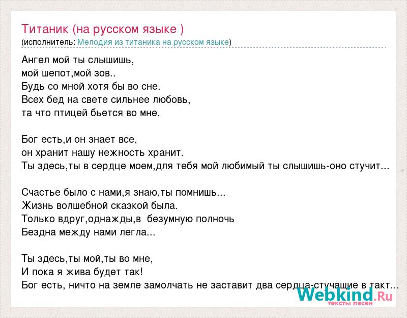 Ангел мой ты слышишь, мой шепот,мой зов.. Будь со мной хотя бы во сне. Всех бед на свете сильнее любовь, та что птицей бьется во мне. Бог есть,и он знает все, он хранит нашу нежность хранит. Ты здесь,ты в сердце моем,для тебя мой любимый ты слышишь-оно стучит... Счастье было с нами,я знаю,ты помнишь... Жизнь волшебной сказкой была. Только вдруг,однажды,в безумную полночь Бездна между нами легла... Ты здесь,ты мой,ты во мне, И пока я жива будет так! Бог есть, ничто на земле замолчать не заставит два сердца-стучащие в такт...