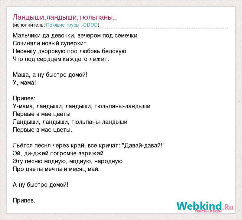 Мальчики да девочки, вечером под семечки Сочиняли новый суперхит Песенку дворовую про любовь бедовую Что под сердцем каждого лежит. Маша, а-ну быстро домой! У, мама! Припев: У-мама, ландыши, ландыши, тюльпаны-ландыши Первые в мае цветы Ландыши, ландыши, тюльпаны-ландыши Первые в мае цветы. Льётся песня через край, все кричат: "Давай-давай!" Эй, ди-джей погромче заряжай Эту песню модную, модную, народную Про цветы мечты и месяц май. А-ну быстро домой! Припев.