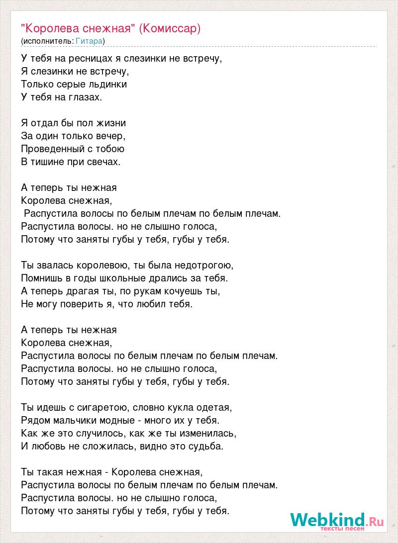 У тебя на ресницах я слезинки не встречу, Я слезинки не встречу, Только серые льдинки У тебя на глазах. Я отдал бы пол жизни За один только вечер, Проведенный с тобою В тишине при свечах. А теперь ты нежная Королева снежная, Распустила волосы по белым плечам по белым плечам. Распустила волосы. но не слышно голоса, Потому что заняты губы у тебя, губы у тебя. Ты звалась королевою, ты была недотрогою, Помнишь в годы школьные дрались за тебя. А теперь драгая ты, по рукам кочуешь ты, Не могу поверить я, что любил тебя. А теперь ты нежная Королева снежная, Распустила волосы по белым плечам по белым плечам. Распустила волосы. но не слышно голоса, Потому что заняты губы у тебя, губы у тебя. Ты идешь с сигаретою, словно кукла одетая, Рядом мальчики модные - много их у тебя. Как же это случилось, как же ты изменилась, И любовь не сложилась, видно это судьба. Ты такая нежная - Королева снежная, Распустила волосы по белым плечам по белым плечам. Распустила волосы. но не слышно голоса, Потому что заняты губы у тебя, губы у тебя.