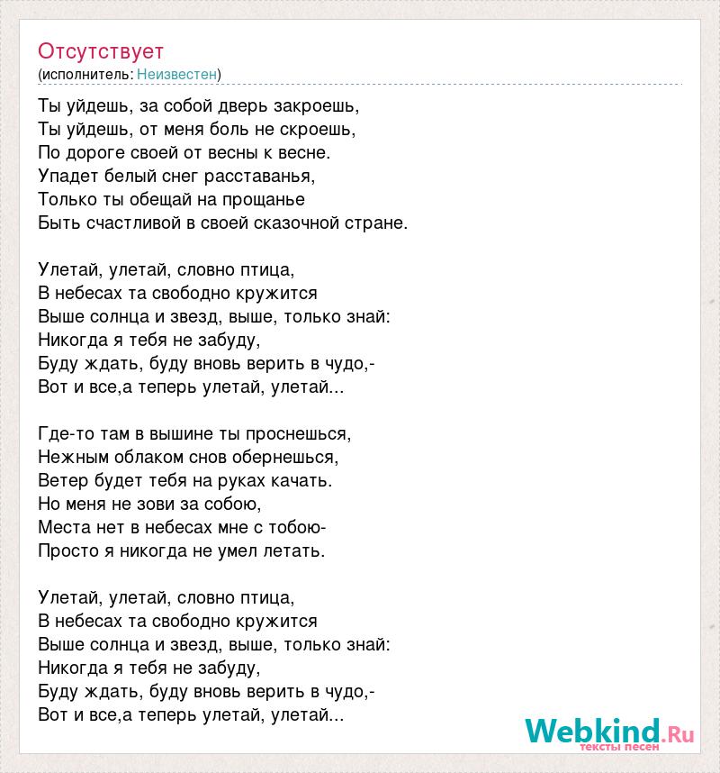 Ты уйдешь, за собой дверь закроешь, Ты уйдешь, от меня боль не скроешь, По дороге своей от весны к весне. Упадет белый снег расставанья, Только ты обещай на прощанье Быть счастливой в своей сказочной стране. Улетай, улетай, словно птица, В небесах та свободно кружится Выше солнца и звезд, выше, только знай: Никогда я тебя не забуду, Буду ждать, буду вновь верить в чудо,- Вот и все,а теперь улетай, улетай... Где-то там в вышине ты проснешься, Нежным облаком снов обернешься, Ветер будет тебя на руках качать. Но меня не зови за собою, Места нет в небесах мне с тобою- Просто я никогда не умел летать. Улетай, улетай, словно птица, В небесах та свободно кружится Выше солнца и звезд, выше, только знай: Никогда я тебя не забуду, Буду ждать, буду вновь верить в чудо,- Вот и все,а теперь улетай, улетай...
