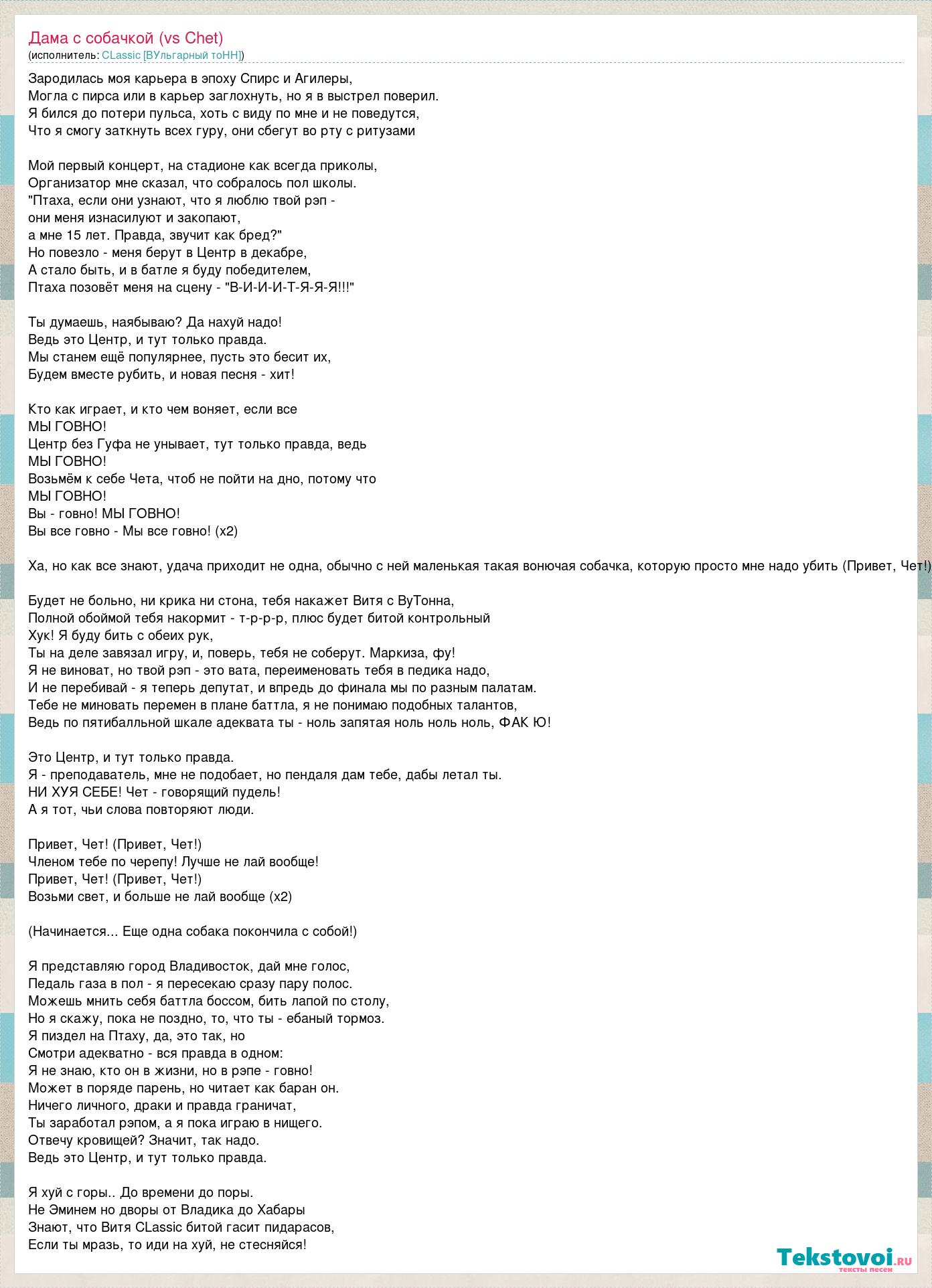 Зародилась моя карьера в эпоху Спирс и Агилеры, Могла с пирса или в карьер заглохнуть, но я в выстрел поверил. Я бился до потери пульса, хоть с виду по мне и не поведутся, Что я смогу заткнуть всех гуру, они сбегут во рту с ритузами Мой первый концерт, на стадионе как всегда приколы, Организатор мне сказал, что собралось пол школы. "Птаха, если они узнают, что я люблю твой рэп - они меня изнасилуют и закопают, а мне 15 лет. Правда, звучит как бред?" Но повезло - меня берут в Центр в декабре, А стало быть, и в батле я буду победителем, Птаха позовёт меня на сцену - "В-И-И-И-Т-Я-Я-Я!!!" Ты думаешь, наябываю? Да нахуй надо! Ведь это Центр, и тут только правда. Мы станем ещё популярнее, пусть это бесит их, Будем вместе рубить, и новая песня - хит! Кто как играет, и кто чем воняет, если все МЫ ГОВНО! Центр без Гуфа не унывает, тут только правда, ведь МЫ ГОВНО! Возьмём к себе Чета, чтоб не пойти на дно, потому что МЫ ГОВНО! Вы - говно! МЫ ГОВНО! Вы все говно - Мы все говно! (x2) Ха, но как все знают, удача приходит не одна, обычно с ней маленькая такая вонючая собачка, которую просто мне надо убить (Привет, Чет!) Будет не больно, ни крика ни стона, тебя накажет Витя с ВуТонна, Полной обоймой тебя накормит - т-р-р-р, плюс будет битой контрольный Хук! Я буду бить с обеих рук, Ты на деле завязал игру, и, поверь, тебя не соберут. Маркиза, фу! Я не виноват, но твой рэп - это вата, переименовать тебя в педика надо, И не перебивай - я теперь депутат, и впредь до финала мы по разным палатам. Тебе не миновать перемен в плане баттла, я не понимаю подобных талантов, Ведь по пятибалльной шкале адеквата ты - ноль запятая ноль ноль ноль, ФАК Ю! Это Центр, и тут только правда. Я - преподаватель, мне не подобает, но пендаля дам тебе, дабы летал ты. НИ ХУЯ СЕБЕ! Чет - говорящий пудель! А я тот, чьи слова повторяют люди. Привет, Чет! (Привет, Чет!) Членом тебе по черепу! Лучше не лай вообще! Привет, Чет! (Привет, Чет!) Возьми свет, и больше не лай вообще (x2) (Начинается... Еще одна собака покончила с собой!) Я представляю город Владивосток, дай мне голос, Педаль газа в пол - я пересекаю сразу пару полос. Можешь мнить себя баттла боссом, бить лапой по столу, Но я скажу, пока не поздно, то, что ты - ебаный тормоз. Я пиздел на Птаху, да, это так, но Смотри адекватно - вся правда в одном: Я не знаю, кто он в жизни, но в рэпе - говно! Может в поряде парень, но читает как баран он. Ничего личного, драки и правда граничат, Ты заработал рэпом, а я пока играю в нищего. Отвечу кровищей? Значит, так надо. Ведь это Центр, и тут только правда. Я хуй с горы.. До времени до поры. Не Эминем но дворы от Владика до Хабары Знают, что Витя CLassic битой гасит пидарасов, Если ты мразь, то иди на хуй, не стесняйся!