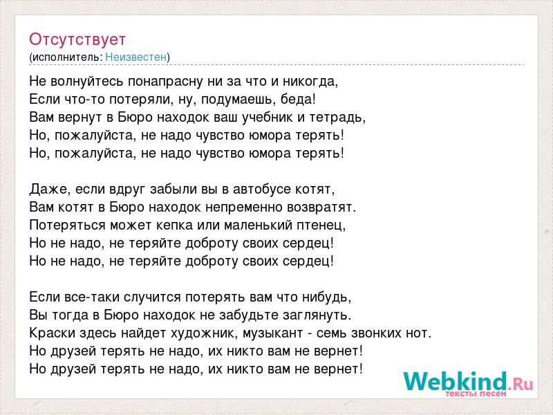 Не волнуйтесь понапрасну ни за что и никогда, Если что-то потеряли, ну, подумаешь, беда! Вам вернут в Бюро находок ваш учебник и тетрадь, Но, пожалуйста, не надо чувство юмора терять! Но, пожалуйста, не надо чувство юмора терять! Даже, если вдруг забыли вы в автобусе котят, Вам котят в Бюро находок непременно возвратят. Потеряться может кепка или маленький птенец, Но не надо, не теряйте доброту своих сердец! Но не надо, не теряйте доброту своих сердец! Если все-таки случится потерять вам что нибудь, Вы тогда в Бюро находок не забудьте заглянуть. Краски здесь найдет художник, музыкант - семь звонких нот. Но друзей терять не надо, их никто вам не вернет! Но друзей терять не надо, их никто вам не вернет!