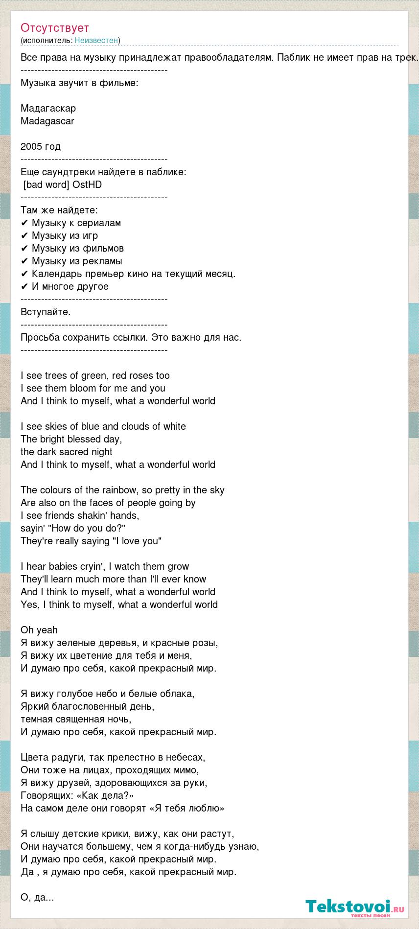 Все права на музыку принадлежат правообладателям. Паблик не имеет прав на трек. ------------------------------------------- Музыка звучит в фильме: Мадагаскар Madagascar 2005 год ------------------------------------------- Еще саундтреки найдете в паблике: [bad word] OstHD ------------------------------------------- Там же найдете: ✔ Музыку к сериалам ✔ Музыку из игр ✔ Музыку из фильмов ✔ Музыку из рекламы ✔ Календарь премьер кино на текущий месяц. ✔ И многое другое ------------------------------------------- Вступайте. ------------------------------------------- Просьба сохранить ссылки. Это важно для нас. ------------------------------------------- I see trees of green, red roses too I see them bloom for me and you And I think to myself, what a wonderful world I see skies of blue and clouds of white The bright blessed day, the dark sacred night And I think to myself, what a wonderful world The colours of the rainbow, so pretty in the sky Are also on the faces of people going by I see friends shakin' hands, sayin' "How do you do?" They're really saying "I love you" I hear babies cryin', I watch them grow They'll learn much more than I'll ever know And I think to myself, what a wonderful world Yes, I think to myself, what a wonderful world Oh yeah Я вижу зеленые деревья, и красные розы, Я вижу их цветение для тебя и меня, И думаю про себя, какой прекрасный мир. Я вижу голубое небо и белые облака, Яркий благословенный день, темная священная ночь, И думаю про себя, какой прекрасный мир. Цвета радуги, так прелестно в небесах, Они тоже на лицах, проходящих мимо, Я вижу друзей, здоровающихся за руки, Говорящих: «Как дела?» На самом деле они говорят «Я тебя люблю» Я слышу детские крики, вижу, как они растут, Они научатся большему, чем я когда-нибудь узнаю, И думаю про себя, какой прекрасный мир. Да , я думаю про себя, какой прекрасный мир. О, да...