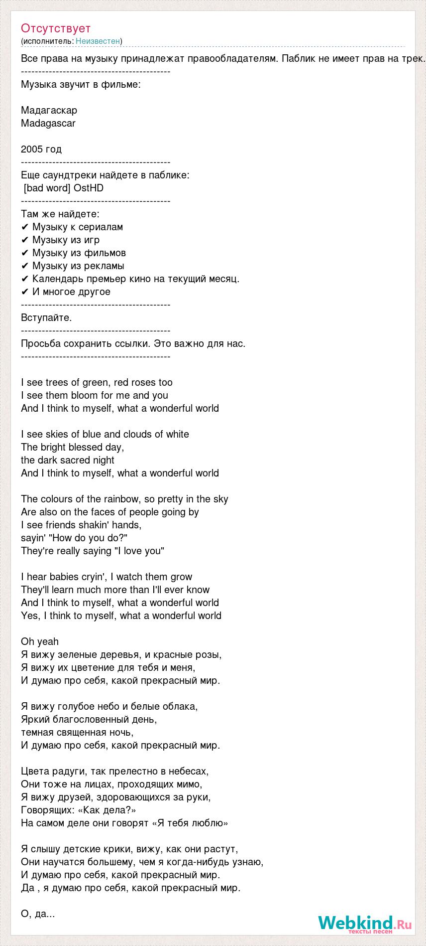 Все права на музыку принадлежат правообладателям. Паблик не имеет прав на трек. ------------------------------------------- Музыка звучит в фильме: Мадагаскар Madagascar 2005 год ------------------------------------------- Еще саундтреки найдете в паблике: [bad word] OstHD ------------------------------------------- Там же найдете: ✔ Музыку к сериалам ✔ Музыку из игр ✔ Музыку из фильмов ✔ Музыку из рекламы ✔ Календарь премьер кино на текущий месяц. ✔ И многое другое ------------------------------------------- Вступайте. ------------------------------------------- Просьба сохранить ссылки. Это важно для нас. ------------------------------------------- I see trees of green, red roses too I see them bloom for me and you And I think to myself, what a wonderful world I see skies of blue and clouds of white The bright blessed day, the dark sacred night And I think to myself, what a wonderful world The colours of the rainbow, so pretty in the sky Are also on the faces of people going by I see friends shakin' hands, sayin' "How do you do?" They're really saying "I love you" I hear babies cryin', I watch them grow They'll learn much more than I'll ever know And I think to myself, what a wonderful world Yes, I think to myself, what a wonderful world Oh yeah Я вижу зеленые деревья, и красные розы, Я вижу их цветение для тебя и меня, И думаю про себя, какой прекрасный мир. Я вижу голубое небо и белые облака, Яркий благословенный день, темная священная ночь, И думаю про себя, какой прекрасный мир. Цвета радуги, так прелестно в небесах, Они тоже на лицах, проходящих мимо, Я вижу друзей, здоровающихся за руки, Говорящих: «Как дела?» На самом деле они говорят «Я тебя люблю» Я слышу детские крики, вижу, как они растут, Они научатся большему, чем я когда-нибудь узнаю, И думаю про себя, какой прекрасный мир. Да , я думаю про себя, какой прекрасный мир. О, да...