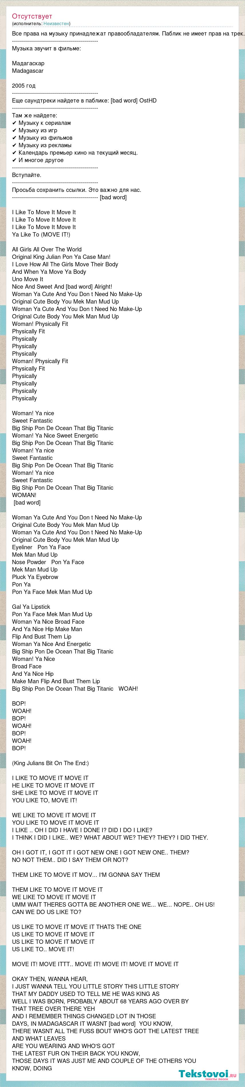 Все права на музыку принадлежат правообладателям. Паблик не имеет прав на трек. ------------------------------------------- Музыка звучит в фильме: Мадагаскар Madagascar 2005 год ------------------------------------------- Еще саундтреки найдете в паблике: [bad word] OstHD ------------------------------------------- Там же найдете: ✔ Музыку к сериалам ✔ Музыку из игр ✔ Музыку из фильмов ✔ Музыку из рекламы ✔ Календарь премьер кино на текущий месяц. ✔ И многое другое ------------------------------------------- Вступайте. ------------------------------------------- Просьба сохранить ссылки. Это важно для нас. ------------------------------------------- (Chorus) I Like To Move It Move It I Like To Move It Move It I Like To Move It Move It Ya Like To (MOVE IT!) All Girls All Over The World Original King Julian Pon Ya Case Man! I Love How All The Girls Move Their Body And When Ya Move Ya Body Uno Move It Nice And Sweet And [bad word] Alright! Woman Ya Cute And You Don t Need No Make-Up Original Cute Body You Mek Man Mud Up Woman Ya Cute And You Don t Need No Make-Up Original Cute Body You Mek Man Mud Up Woman! Physically Fit Physically Fit Physically Physically Physically Woman! Physically Fit Physically Fit Physically Physically Physically Physically Woman! Ya nice Sweet Fantastic Big Ship Pon De Ocean That Big Titanic Woman! Ya Nice Sweet Energetic Big Ship Pon De Ocean That Big Titanic Woman! Ya nice Sweet Fantastic Big Ship Pon De Ocean That Big Titanic Woman! Ya nice Sweet Fantastic Big Ship Pon De Ocean That Big Titanic WOMAN! (Chorus) Woman Ya Cute And You Don t Need No Make-Up Original Cute Body You Mek Man Mud Up Woman Ya Cute And You Don t Need No Make-Up Original Cute Body You Mek Man Mud Up Eyeliner Pon Ya Face Mek Man Mud Up Nose Powder Pon Ya Face Mek Man Mud Up Pluck Ya Eyebrow Pon Ya Pon Ya Face Mek Man Mud Up Gal Ya Lipstick Pon Ya Face Mek Man Mud Up Woman Ya Nice Broad Face And Ya Nice Hip Make Man Flip And Bust Them Lip Woman Ya Nice And Energetic Big Ship Pon De Ocean That Big Titanic Woman! Ya Nice Broad Face And Ya Nice Hip Make Man Flip And Bust Them Lip Big Ship Pon De Ocean That Big Titanic WOAH! BOP! WOAH! BOP! WOAH! BOP! WOAH! BOP! (King Julians Bit On The End:) I LIKE TO MOVE IT MOVE IT HE LIKE TO MOVE IT MOVE IT SHE LIKE TO MOVE IT MOVE IT YOU LIKE TO, MOVE IT! WE LIKE TO MOVE IT MOVE IT YOU LIKE TO MOVE IT MOVE IT I LIKE .. OH I DID I HAVE I DONE I? DID I DO I LIKE? I THINK I DID I LIKE.. WE? WHAT ABOUT WE? THEY? THEY? I DID THEY. OH I GOT IT, I GOT IT I GOT NEW ONE I GOT NEW ONE.. THEM? NO NOT THEM.. DID I SAY THEM OR NOT? THEM LIKE TO MOVE IT MOV... I'M GONNA SAY THEM THEM LIKE TO MOVE IT MOVE IT WE LIKE TO MOVE IT MOVE IT UMM WAIT THERES GOTTA BE ANOTHER ONE WE... WE... NOPE.. OH US! CAN WE DO US LIKE TO? US LIKE TO MOVE IT MOVE IT THATS THE ONE US LIKE TO MOVE IT MOVE IT US LIKE TO MOVE IT MOVE IT US LIKE TO.. MOVE IT! MOVE IT! MOVE ITTT.. MOVE IT! MOVE IT! MOVE IT MOVE IT OKAY THEN, WANNA HEAR, I JUST WANNA TELL YOU LITTLE STORY THIS LITTLE STORY THAT MY DADDY USED TO TELL ME HE WAS KING AS WELL I WAS BORN, PROBABLY ABOUT 68 YEARS AGO OVER BY THAT TREE OVER THERE YEH AND I REMEMBER THINGS CHANGED LOT IN THOSE DAYS, IN MADAGASCAR IT WASNT SO COMMERCIAL, YOU KNOW, THERE WASNT ALL THE FUSS BOUT WHO'S GOT THE LATEST TREE AND WHAT LEAVES ARE YOU WEARING AND WHO'S GOT THE LATEST FUR ON THEIR BACK YOU KNOW, THOSE DAYS IT WAS JUST ME AND COUPLE OF THE OTHERS YOU KNOW, DOING