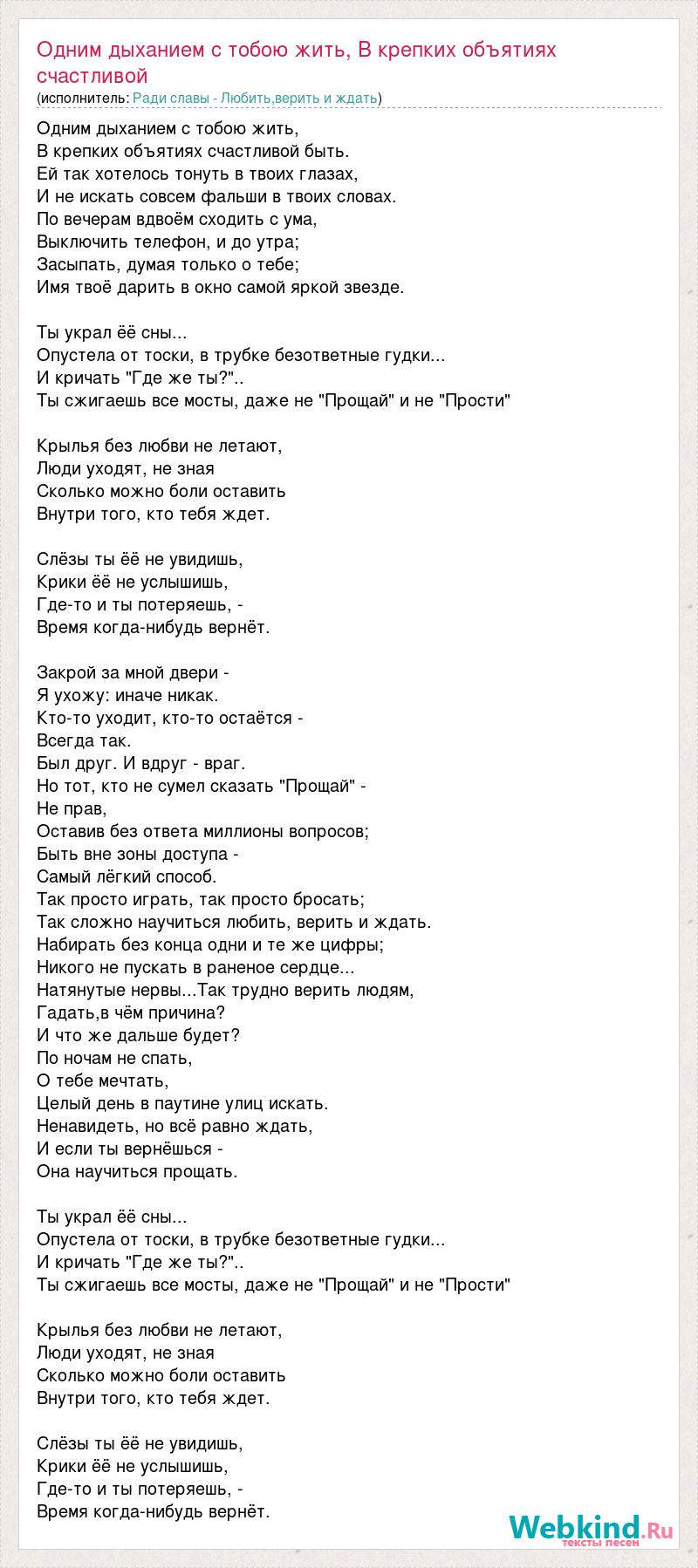 Главная→Исполнители→Ради славы - Любить,верить и ждать→Одним дыханием с тобою жить, В крепких объятиях счастливой быть. Ей так хотелось