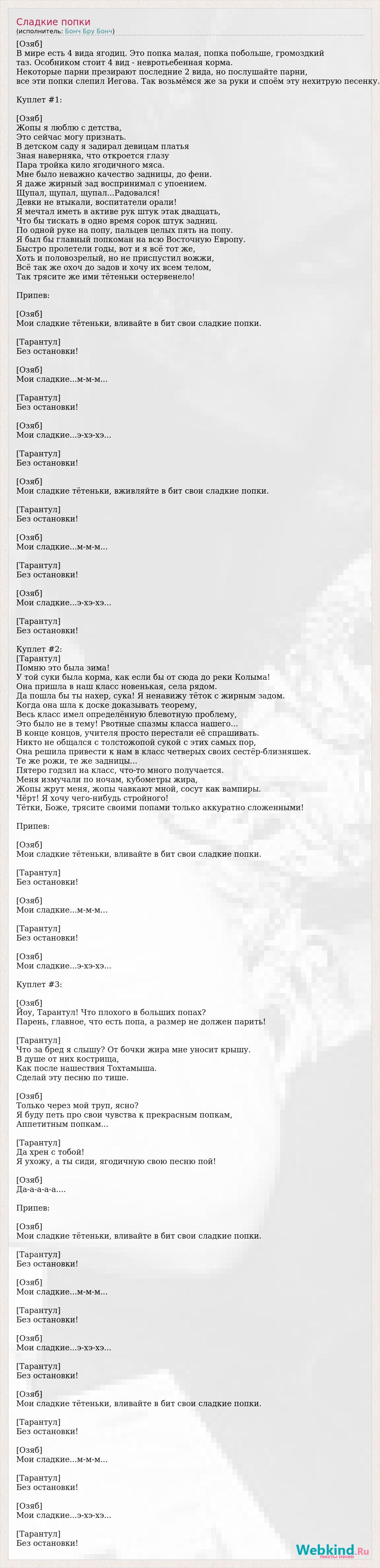 [Озяб] В мире есть 4 вида ягодиц. Это попка малая, попка побольше, громоздкий таз. Особником стоит 4 вид - невротьебенная корма. Некоторые парни презирают последние 2 вида, но послушайте парни, все эти попки слепил Иегова. Так возьмёмся же за руки и споём эту нехитрую песенку. Куплет #1: [Озяб] Жопы я люблю с детства, Это сейчас могу признать. В детском саду я задирал девицам платья Зная наверняка, что откроется глазу Пара тройка кило ягодичного мяса. Мне было неважно качество задницы, до фени. Я даже жирный зад воспринимал с упоением. Щупал, щупал, щупал...Радовался! Девки не втыкали, воспитатели орали! Я мечтал иметь в активе рук штук этак двадцать, Что бы тискать в одно время сорок штук задниц. По одной руке на попу, пальцев целых пять на попу. Я был бы главный попкоман на всю Восточную Европу. Быстро пролетели годы, вот и я всё тот же, Хоть и половозрелый, но не приспустил вожжи, Всё так же охоч до задов и хочу их всем телом, Так трясите же ими тётеньки остервенело! Припев: [Озяб] Мои сладкие тётеньки, вливайте в бит свои сладкие попки. [Тарантул] Без остановки! [Озяб] Мои сладкие...м-м-м... [Тарантул] Без остановки! [Озяб] Мои сладкие...э-хэ-хэ... [Тарантул] Без остановки! [Озяб] Мои сладкие тётеньки, вживляйте в бит свои сладкие попки. [Тарантул] Без остановки! [Озяб] Мои сладкие...м-м-м... [Тарантул] Без остановки! [Озяб] Мои сладкие...э-хэ-хэ... [Тарантул] Без остановки! Куплет #2: [Тарантул] Помню это была зима! У той суки была корма, как если бы от сюда до реки Колыма! Она пришла в наш класс новенькая, села рядом. Да пошла бы ты нахер, сука! Я ненавижу тёток с жирным задом. Когда она шла к доске доказывать теорему, Весь класс имел определённую блевотную проблему, Это было не в тему! Рвотные спазмы класса нашего... В конце концов, учителя просто перестали её спрашивать. Никто не общался с толстожопой сукой с этих самых пор, Она решила привести к нам в класс четверых своих сестёр-близняшек. Те же рожи, те же задницы... Пятеро годзил на класс, что-то много получается. Меня измучали по ночам, кубометры жира, Жопы жрут меня, жопы чавкают мной, сосут как вампиры. Чёрт! Я хочу чего-нибудь стройного! Тётки, Боже, трясите своими попами только аккуратно сложенными! Припев: [Озяб] Мои сладкие тётеньки, вливайте в бит свои сладкие попки. [Тарантул] Без остановки! [Озяб] Мои сладкие...м-м-м... [Тарантул] Без остановки! [Озяб] Мои сладкие...э-хэ-хэ... Куплет #3: [Озяб] Йоу, Тарантул! Что плохого в больших попах? Парень, главное, что есть попа, а размер не должен парить! [Тарантул] Что за бред я слышу? От бочки жира мне уносит крышу. В душе от них кострища, Как после нашествия Тохтамыша. Сделай эту песню по тише. [Озяб] Только через мой труп, ясно? Я буду петь про свои чувства к прекрасным попкам, Аппетитным попкам... [Тарантул] Да хрен с тобой! Я ухожу, а ты сиди, ягодичную свою песню пой! [Озяб] Да-а-а-а-а.... Припев: [Озяб] Мои сладкие тётеньки, вливайте в бит свои сладкие попки. [Тарантул] Без остановки! [Озяб] Мои сладкие...м-м-м... [Тарантул] Без остановки! [Озяб] Мои сладкие...э-хэ-хэ... [Тарантул] Без остановки! [Озяб] Мои сладкие тётеньки, вливайте в бит свои сладкие попки. [Тарантул] Без остановки! [Озяб] Мои сладкие...м-м-м... [Тарантул] Без остановки! [Озяб] Мои сладкие...э-хэ-хэ... [Тарантул] Без остановки!