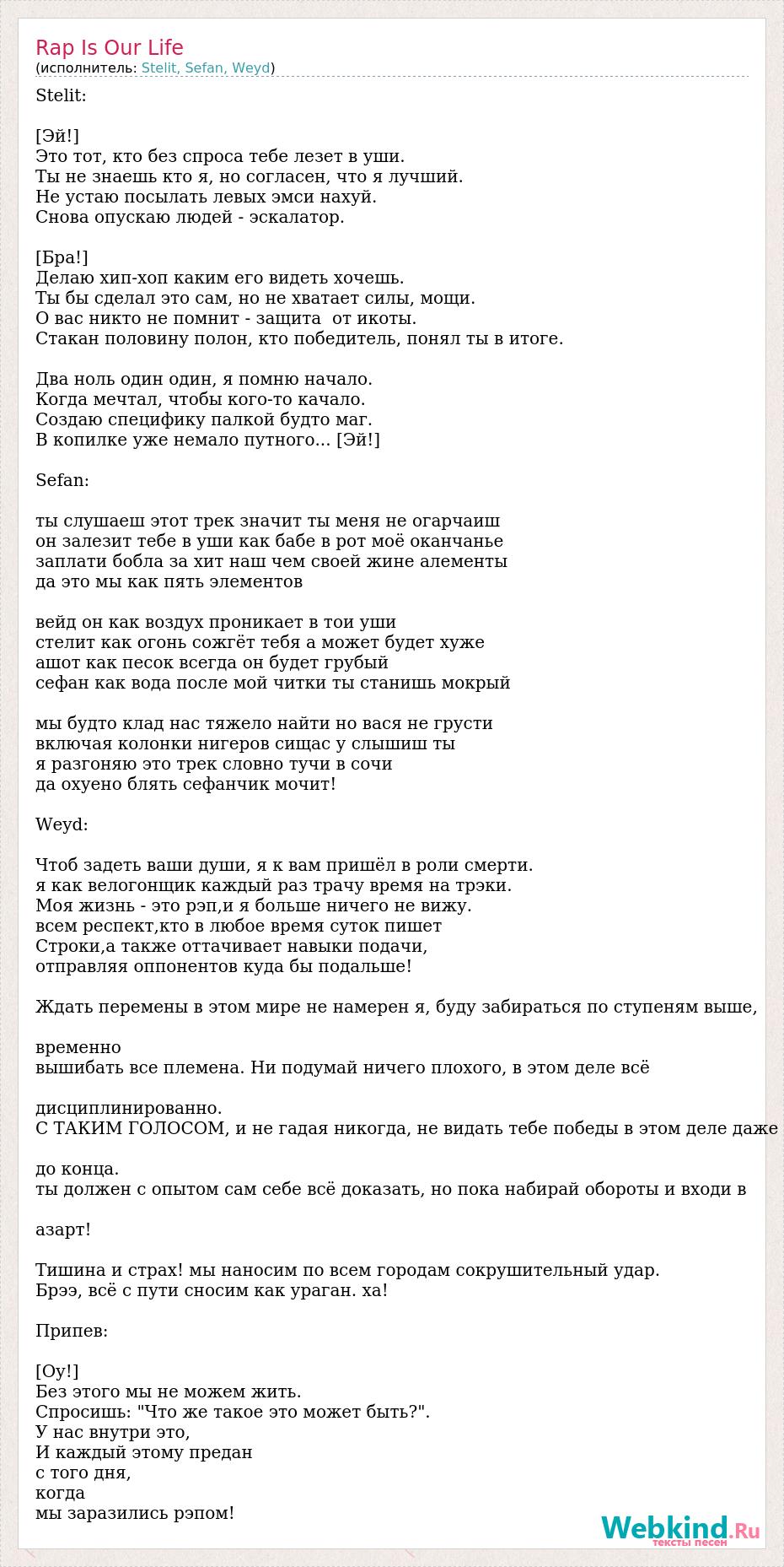 Stelit: [Эй!] Это тот, кто без спроса тебе лезет в уши. Ты не знаешь кто я, но согласен, что я лучший. Не устаю посылать левых эмси нахуй. Снова опускаю людей - эскалатор. [Бра!] Делаю хип-хоп каким его видеть хочешь. Ты бы сделал это сам, но не хватает силы, мощи. О вас никто не помнит - защита от икоты. Стакан половину полон, кто победитель, понял ты в итоге. Два ноль один один, я помню начало. Когда мечтал, чтобы кого-то качало. Создаю специфику палкой будто маг. В копилке уже немало путного... [Эй!] Sefan: ты cлушаеш этот трек значит ты меня не огарчаиш он залезит тебе в уши как бабе в рот моё оканчанье заплати бобла за хит наш чем своей жине алементы да это мы как пять элементов вейд он как воздух проникает в тои уши стелит как огонь сожгёт тебя а может будет хуже ашот как песок всегда он будет грубый сефан как вода после мой читки ты станишь мокрый мы будто клад нас тяжело найти но вася не грусти включая колонки нигеров сищас у слышиш ты я разгоняю это трек словно тучи в сочи да охуено блять сефанчик мочит! Weyd: Чтоб задеть ваши души, я к вам пришёл в роли смерти. я как велогонщик каждый раз трачу время на трэки. Моя жизнь - это рэп,и я больше ничего не вижу. всем респект,кто в любое время суток пишет Строки,а также оттачивает навыки подачи, отправляя оппонентов куда бы подальше! Ждать перемены в этом мире не намерен я, буду забираться по ступеням выше, временно вышибать все племена. Ни подумай ничего плохого, в этом деле всё дисциплинированно. С ТАКИМ ГОЛОСОМ, и не гадая никогда, не видать тебе победы в этом деле даже до конца. ты должен с опытом сам себе всё доказать, но пока набирай обороты и входи в азарт! Тишина и страх! мы наносим по всем городам сокрушительный удар. Брээ, всё с пути сносим как ураган. ха! Припев: [Оу!] Без этого мы не можем жить. Спросишь: "Что же такое это может быть?". У нас внутри это, И каждый этому предан с того дня, когда мы заразились рэпом!