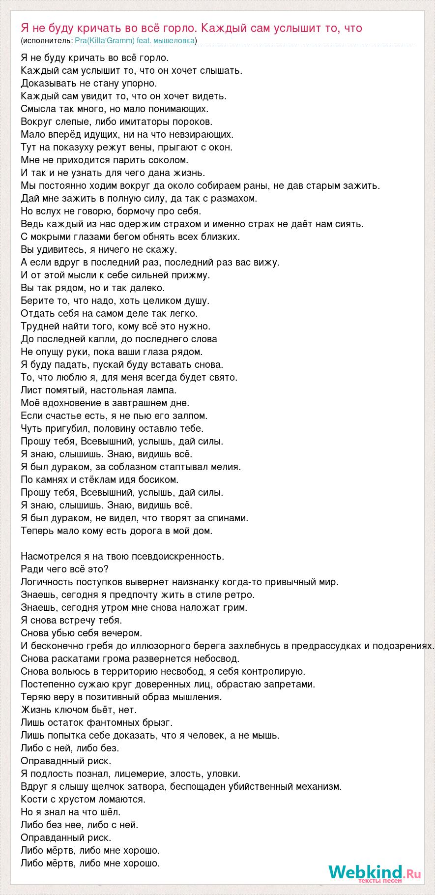Я не буду кричать во всё горло. Каждый сам услышит то, что он хочет слышать. Доказывать не стану упорно. Каждый сам увидит то, что он хочет видеть. Смысла так много, но мало понимающих. Вокруг слепые, либо имитаторы пороков. Мало вперёд идущих, ни на что невзирающих. Тут на показуху режут вены, прыгают с окон. Мне не приходится парить соколом. И так и не узнать для чего дана жизнь. Мы постоянно ходим вокруг да около собираем раны, не дав старым зажить. Дай мне зажить в полную силу, да так с размахом. Но вслух не говорю, бормочу про себя. Ведь каждый из нас одержим страхом и именно страх не даёт нам сиять. С мокрыми глазами бегом обнять всех близких. Вы удивитесь, я ничего не скажу. А если вдруг в последний раз, последний раз вас вижу. И от этой мысли к себе сильней прижму. Вы так рядом, но и так далеко. Берите то, что надо, хоть целиком душу. Отдать себя на самом деле так легко. Трудней найти того, кому всё это нужно. До последней капли, до последнего слова Не опущу руки, пока ваши глаза рядом. Я буду падать, пускай буду вставать снова. То, что люблю я, для меня всегда будет свято. Лист помятый, настольная лампа. Моё вдохновение в завтрашнем дне. Если счастье есть, я не пью его залпом. Чуть пригубил, половину оставлю тебе. Прошу тебя, Всевышний, услышь, дай силы. Я знаю, слышишь. Знаю, видишь всё. Я был дураком, за соблазном стаптывал мелия. По камнях и стёклам идя босиком. Прошу тебя, Всевышний, услышь, дай силы. Я знаю, слышишь. Знаю, видишь всё. Я был дураком, не видел, что творят за спинами. Теперь мало кому есть дорога в мой дом. Насмотрелся я на твою псевдоискренность. Ради чего всё это? Логичность поступков вывернет наизнанку когда-то привычный мир. Знаешь, сегодня я предпочту жить в стиле ретро. Знаешь, сегодня утром мне снова наложат грим. Я снова встречу тебя. Снова убью себя вечером. И бесконечно гребя до иллюзорного берега захлебнусь в предрассудках и подозрениях. Снова раскатами грома развернется небосвод. Снова вольюсь в территорию несвобод, я себя контролирую. Постепенно сужаю круг доверенных лиц, обрастаю запретами. Теряю веру в позитивный образ мышления. Жизнь ключом бьёт, нет. Лишь остаток фантомных брызг. Лишь попытка себе доказать, что я человек, а не мышь. Либо с ней, либо без. Оправаднный риск. Я подлость познал, лицемерие, злость, уловки. Вдруг я слышу щелчок затвора, беспощаден убийственный механизм. Кости с хрустом ломаются. Но я знал на что шёл. Либо без нее, либо с ней. Оправданный риск. Либо мёртв, либо мне хорошо. Либо мёртв, либо мне хорошо.