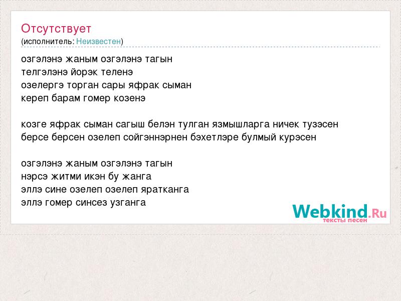 озгэлэнэ жаным озгэлэнэ тагын телгэлэнэ йорэк теленэ озелергэ торган сары яфрак сыман кереп барам гомер козенэ козге яфрак сыман сагыш белэн тулган язмышларга ничек тузэсен берсе берсен озелеп сойгэннэрнен бэхетлэре булмый курэсен озгэлэнэ жаным озгэлэнэ тагын нэрсэ житми икэн бу жанга эллэ сине озелеп озелеп яратканга эллэ гомер синсез узганга