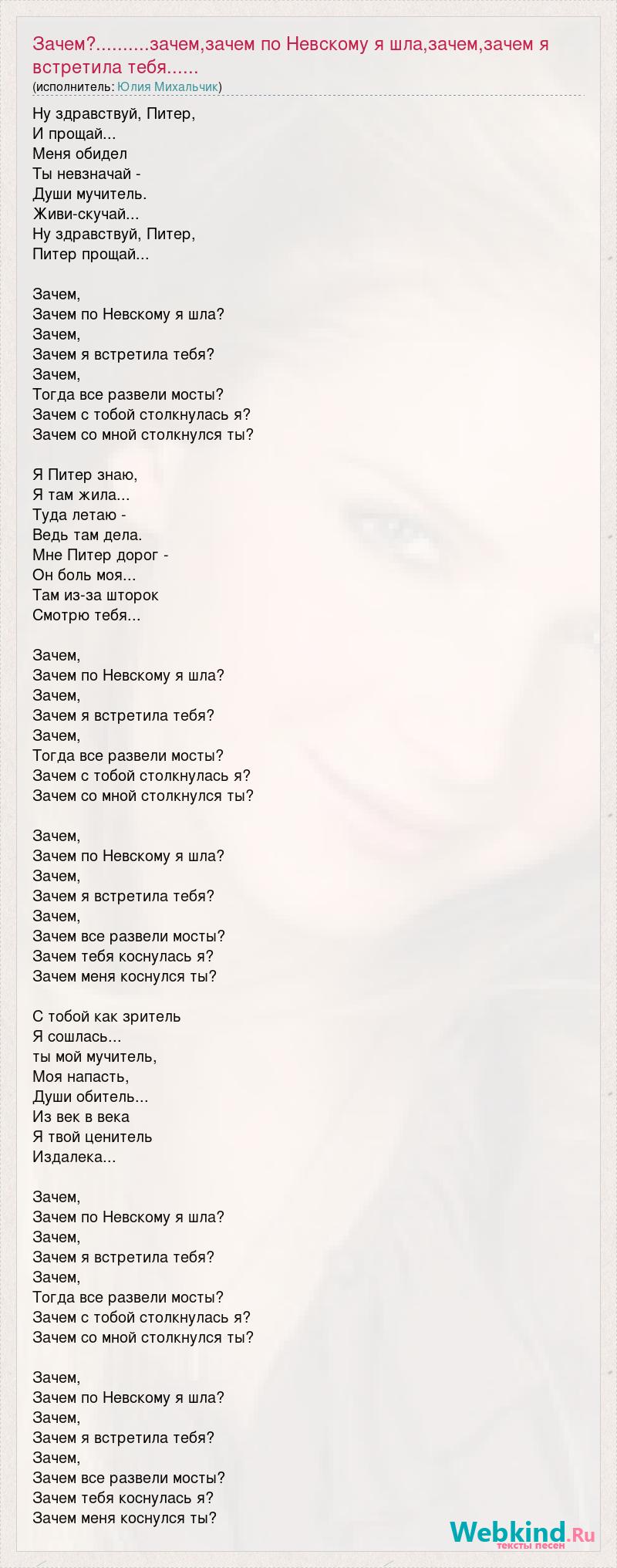 Ну здравствуй, Питер, И прощай... Меня обидел Ты невзначай - Души мучитель. Живи-скучай... Ну здравствуй, Питер, Питер прощай... Зачем, Зачем по Невскому я шла? Зачем, Зачем я встретила тебя? Зачем, Тогда все развели мосты? Зачем с тобой столкнулась я? Зачем со мной столкнулся ты? Я Питер знаю, Я там жила... Туда летаю - Ведь там дела. Мне Питер дорог - Он боль моя... Там из-за шторок Смотрю тебя... Зачем, Зачем по Невскому я шла? Зачем, Зачем я встретила тебя? Зачем, Тогда все развели мосты? Зачем с тобой столкнулась я? Зачем со мной столкнулся ты? Зачем, Зачем по Невскому я шла? Зачем, Зачем я встретила тебя? Зачем, Зачем все развели мосты? Зачем тебя коснулась я? Зачем меня коснулся ты? С тобой как зритель Я сошлась... ты мой мучитель, Моя напасть, Души обитель... Из век в века Я твой ценитель Издалека... Зачем, Зачем по Невскому я шла? Зачем, Зачем я встретила тебя? Зачем, Тогда все развели мосты? Зачем с тобой столкнулась я? Зачем со мной столкнулся ты? Зачем, Зачем по Невскому я шла? Зачем, Зачем я встретила тебя? Зачем, Зачем все развели мосты? Зачем тебя коснулась я? Зачем меня коснулся ты?