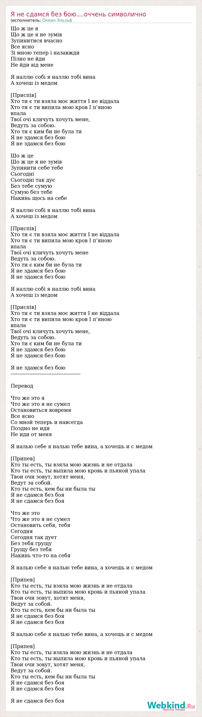 Що ж це я Що ж це я не зумів Зупинитися вчасно Все ясно Зі мною тепер і назавжди Пізно не йди Не йди від мене Я наллю собі я наллю тобі вина А хочеш із медом [Приспів] Хто ти є ти взяла моє життя І не віддала Хто ти є ти випила мою кров І п’яною впала Твої очі кличуть хочуть мене, Ведуть за собою. Хто ти є ким би не була ти Я не здамся без бою Я не здамся без бою Шо ж це Шо ж це я не зумів Зупинити себе тебе Сьогодні Сьогодні так дує Без тебе сумую Сумую без тебе Накинь щось на себе Я наллю собі я наллю тобі вина А хочеш із медом [Приспів] Хто ти є ти взяла моє життя І не віддала Хто ти є ти випила мою кров І п’яною впала Твої очі кличуть хочуть мене Ведуть за собою. Хто ти є ким би не була ти Я не здамся без бою Я не здамся без бою Я наллю собі я наллю тобі вина А хочеш із медом [Приспів] Хто ти є ти взяла моє життя І не віддала Хто ти є ти випила мою кров І п’яною впала Твої очі кличуть хочуть мене, Ведуть за собою. Хто ти є ким би не була ти Я не здамся без бою Я не здамся без бою Я не здамся без бою ----------------------------------------- Перевод Что же это я Что же это я не сумел Остановиться вовремя Все ясно Со мной теперь и навсегда Поздно не иди Не иди от меня Я налью себе я налью тебе вина, а хочешь и с медом [Припев] Кто ты есть, ты взяла мою жизнь и не отдала Кто ты есть, ты выпила мою кровь и пьяной упала Твои очи зовут, хотят меня, Ведут за собой. Кто ты есть, кем бы ни была ты Я не сдамся без боя Я не сдамся без боя Что же это Что же это я не сумел Остановить себя, тебя Сегодня Сегодня так дует Без тебя грущу Грущу без тебя Накинь что-то на себя Я налью себе я налью тебе вина, а хочешь и с медом [Припев] Кто ты есть, ты взяла мою жизнь и не отдала Кто ты есть, ты выпила мою кровь и пьяной упала Твои очи зовут, хотят меня, Ведут за собой. Кто ты есть, кем бы ни была ты Я не сдамся без боя Я не сдамся без боя Я налью себе я налью тебе вина, а хочешь и с медом [Припев] Кто ты есть, ты взяла мою жизнь и не отдала Кто ты есть, ты выпила мою кровь и пьяной упала Твои очи зовут, хотят меня, Ведут за собой. Кто ты есть, кем бы ни была ты Я не сдамся без боя Я не сдамся без боя Я не сдамся без боя