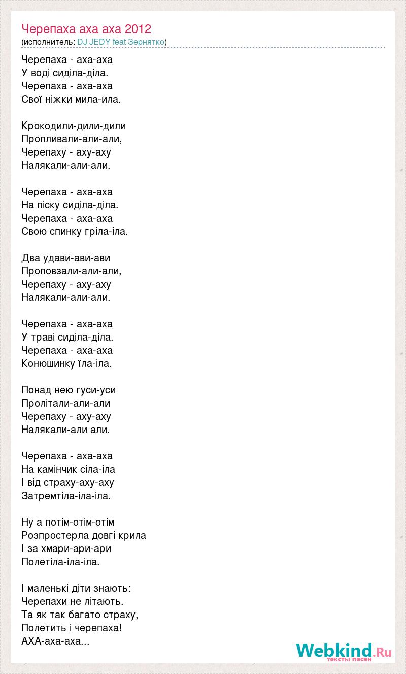 Черепаха - аха-аха У воді сиділа-діла. Черепаха - аха-аха Свої ніжки мила-ила. Крокодили-дили-дили Пропливали-али-али, Черепаху - аху-аху Налякали-али-али. Черепаха - аха-аха На піску сиділа-діла. Черепаха - аха-аха Свою спинку гріла-іла. Два удави-ави-ави Проповзали-али-али, Черепаху - аху-аху Налякали-али-али. Черепаха - аха-аха У траві сиділа-діла. Черепаха - аха-аха Конюшинку їла-іла. Понад нею гуси-уси Пролітали-али-али Черепаху - аху-аху Налякали-али али. Черепаха - аха-аха На камінчик сіла-іла І від страху-аху-аху Затремтіла-іла-іла. Ну а потім-отім-отім Розпростерла довгі крила І за хмари-ари-ари Полетіла-іла-іла. І маленькі діти знають: Черепахи не літають. Та як так багато страху, Полетить і черепаха! АХА-аха-аха...