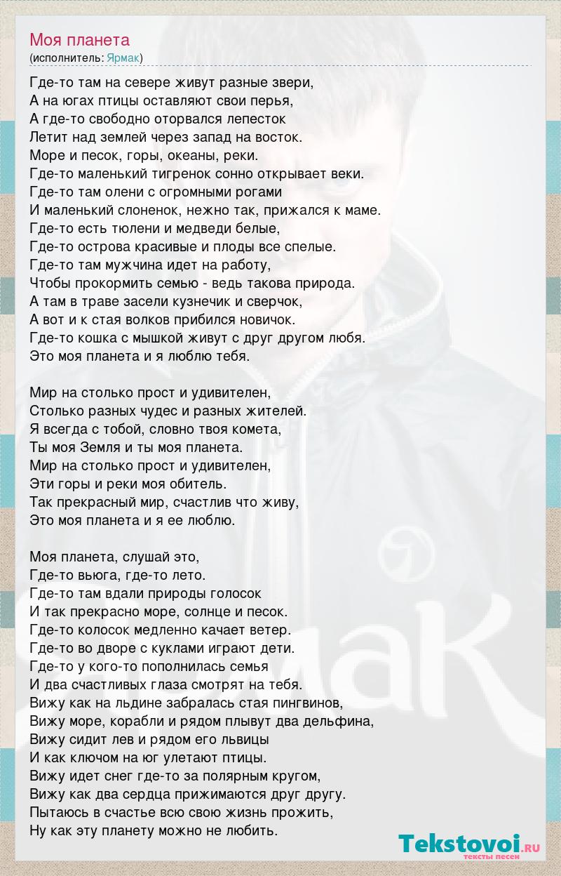 Где-то там на севере живут разные звери, А на югах птицы оставляют свои перья, А где-то свободно оторвался лепесток Летит над землей через запад на восток. Море и песок, горы, океаны, реки. Где-то маленький тигренок сонно открывает веки. Где-то там олени с огромными рогами И маленький слоненок, нежно так, прижался к маме. Где-то есть тюлени и медведи белые, Где-то острова красивые и плоды все спелые. Где-то там мужчина идет на работу, Чтобы прокормить семью - ведь такова природа. А там в траве засели кузнечик и сверчок, А вот и к стая волков прибился новичок. Где-то кошка с мышкой живут с друг другом любя. Это моя планета и я люблю тебя. Мир на столько прост и удивителен, Столько разных чудес и разных жителей. Я всегда с тобой, словно твоя комета, Ты моя Земля и ты моя планета. Мир на столько прост и удивителен, Эти горы и реки моя обитель. Так прекрасный мир, счастлив что живу, Это моя планета и я ее люблю. Моя планета, слушай это, Где-то вьюга, где-то лето. Где-то там вдали природы голосок И так прекрасно море, солнце и песок. Где-то колосок медленно качает ветер. Где-то во дворе с куклами играют дети. Где-то у кого-то пополнилась семья И два счастливых глаза смотрят на тебя. Вижу как на льдине забралась стая пингвинов, Вижу море, корабли и рядом плывут два дельфина, Вижу сидит лев и рядом его львицы И как ключом на юг улетают птицы. Вижу идет снег где-то за полярным кругом, Вижу как два сердца прижимаются друг другу. Пытаюсь в счастье всю свою жизнь прожить, Ну как эту планету можно не любить.