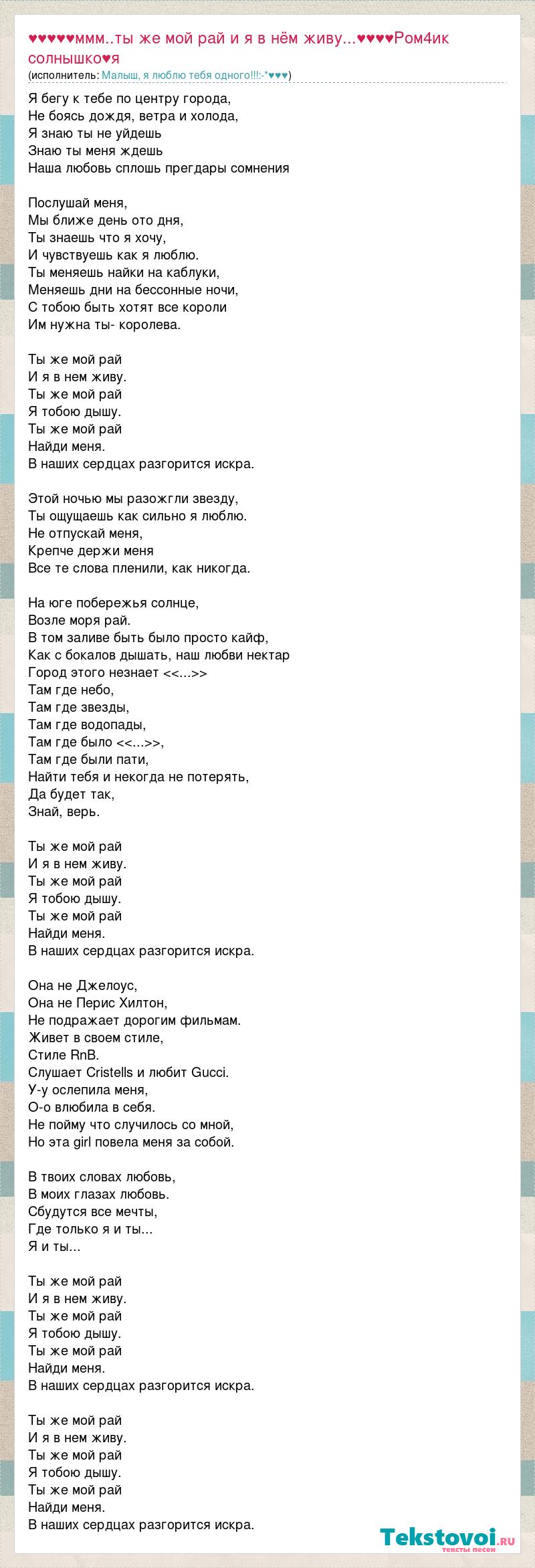 Я бегу к тебе по центру города, Не боясь дождя, ветра и холода, Я знаю ты не уйдешь Знаю ты меня ждешь Наша любовь сплошь прегдары сомнения Послушай меня, Мы ближе день ото дня, Ты знаешь что я хочу, И чувствуешь как я люблю. Ты меняешь найки на каблуки, Меняешь дни на бессонные ночи, С тобою быть хотят все короли Им нужна ты- королева. Ты же мой рай И я в нем живу. Ты же мой рай Я тобою дышу. Ты же мой рай Найди меня. В наших сердцах разгорится искра. Этой ночью мы разожгли звезду, Ты ощущаешь как сильно я люблю. Не отпускай меня, Крепче держи меня Все те слова пленили, как никогда. На юге побережья cолнце, Возле моря рай. В том заливе быть было просто кайф, Как с бокалов дышать, наш любви нектар Город этого незнает <<...>> Там где небо, Там где звезды, Там где водопады, Там где было <<...>>, Там где были пати, Найти тебя и некогда не потерять, Да будет так, Знай, верь. Ты же мой рай И я в нем живу. Ты же мой рай Я тобою дышу. Ты же мой рай Найди меня. В наших сердцах разгорится искра. Она не Джелоус, Она не Перис Хилтон, Не подражает дорогим фильмам. Живет в своем стиле, Стиле RnB. Cлушает Cristells и любит Gucci. У-у ослепила меня, О-о влюбила в себя. Не пойму что случилось со мной, Но эта girl повела меня за собой. В твоих словах любовь, В моих глазах любовь. Сбудутся все мечты, Где только я и ты... Я и ты... Ты же мой рай И я в нем живу. Ты же мой рай Я тобою дышу. Ты же мой рай Найди меня. В наших сердцах разгорится искра. Ты же мой рай И я в нем живу. Ты же мой рай Я тобою дышу. Ты же мой рай Найди меня. В наших сердцах разгорится искра.