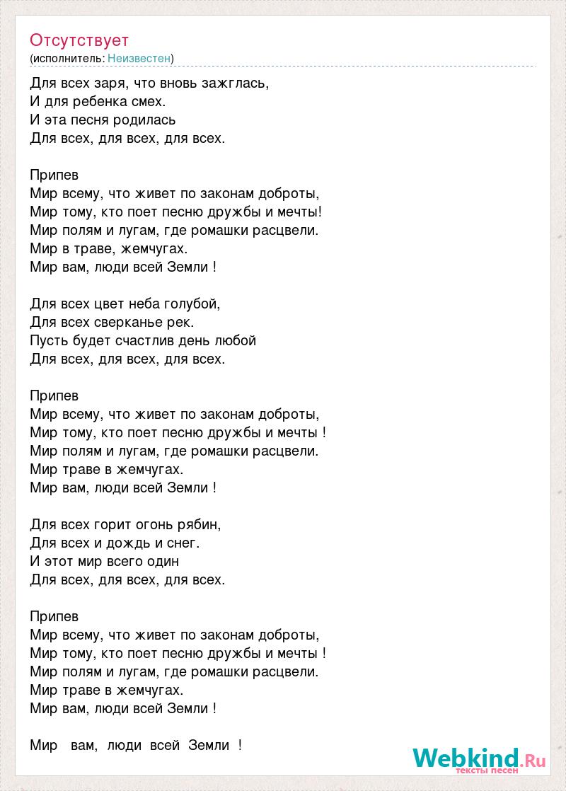 Для всех заря, что вновь зажглась, И для ребенка смех. И эта песня родилась Для всех, для всех, для всех. Припев Мир всему, что живет по законам доброты, Мир тому, кто поет песню дружбы и мечты! Мир полям и лугам, где ромашки расцвели. Мир в траве, жемчугах. Мир вам, люди всей Земли ! Для всех цвет неба голубой, Для всех сверканье рек. Пусть будет счастлив день любой Для всех, для всех, для всех. Припев Мир всему, что живет по законам доброты, Мир тому, кто поет песню дружбы и мечты ! Мир полям и лугам, где ромашки расцвели. Мир траве в жемчугах. Мир вам, люди всей Земли ! Для всех горит огонь рябин, Для всех и дождь и снег. И этот мир всего один Для всех, для всех, для всех. Припев Мир всему, что живет по законам доброты, Мир тому, кто поет песню дружбы и мечты ! Мир полям и лугам, где ромашки расцвели. Мир траве в жемчугах. Мир вам, люди всей Земли ! Мир вам, люди всей Земли !