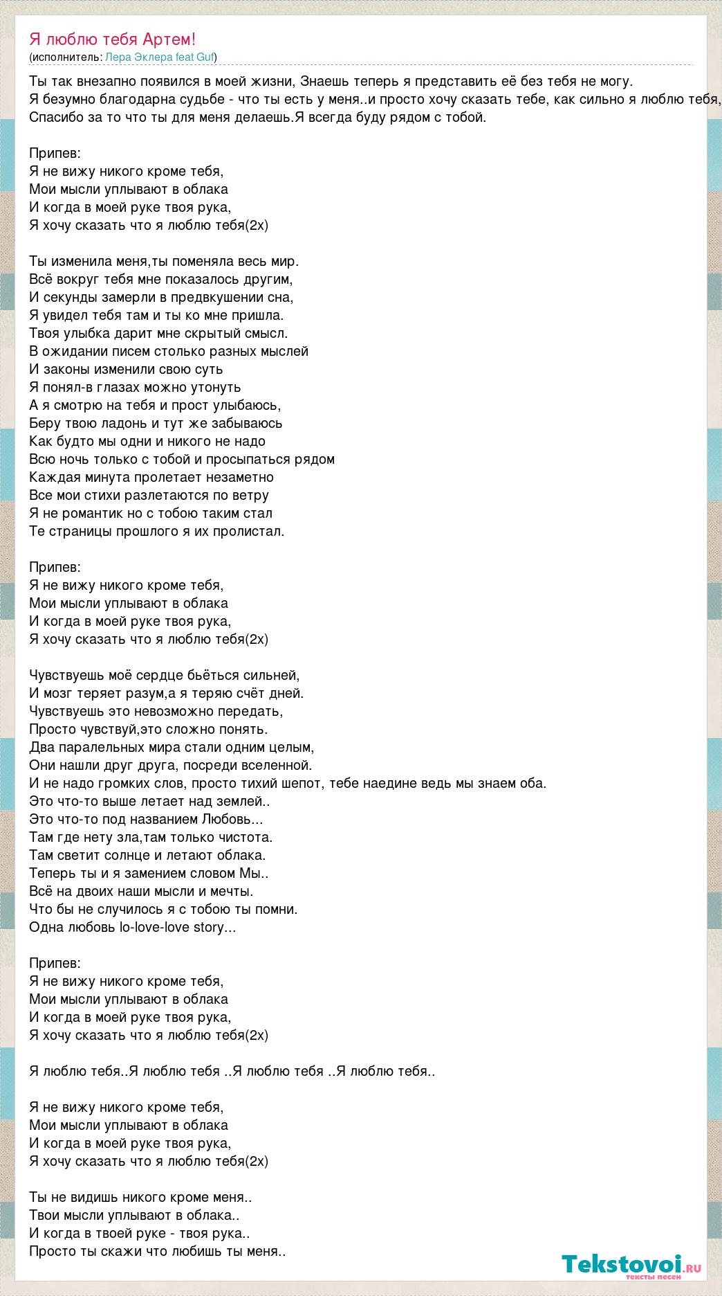 Ты так внезапно появился в моей жизни, Знаешь теперь я представить её без тебя не могу. Я безумно благодарна судьбе - что ты есть у меня..и просто хочу сказать тебе, как сильно я люблю тебя, Спасибо за то что ты для меня делаешь.Я всегда буду рядом с тобой. Припев: Я не вижу никого кроме тебя, Мои мысли уплывают в облака И когда в моей руке твоя рука, Я хочу сказать что я люблю тебя(2х) Ты изменила меня,ты поменяла весь мир. Всё вокруг тебя мне показалось другим, И секунды замерли в предвкушении сна, Я увидел тебя там и ты ко мне пришла. Твоя улыбка дарит мне скрытый смысл. В ожидании писем столько разных мыслей И законы изменили свою суть Я понял-в глазах можно утонуть А я смотрю на тебя и прост улыбаюсь, Беру твою ладонь и тут же забываюсь Как будто мы одни и никого не надо Всю ночь только с тобой и просыпаться рядом Каждая минута пролетает незаметно Все мои стихи разлетаются по ветру Я не романтик но с тобою таким стал Те страницы прошлого я их пролистал. Припев: Я не вижу никого кроме тебя, Мои мысли уплывают в облака И когда в моей руке твоя рука, Я хочу сказать что я люблю тебя(2х) Чувствуешь моё сердце бьёться сильней, И мозг теряет разум,а я теряю счёт дней. Чувствуешь это невозможно передать, Просто чувствуй,это сложно понять. Два паралельных мира стали одним целым, Они нашли друг друга, посреди вселенной. И не надо громких слов, просто тихий шепот, тебе наедине ведь мы знаем оба. Это что-то выше летает над землей.. Это что-то под названием Любовь... Там где нету зла,там только чистота. Там светит солнце и летают облака. Теперь ты и я замением словом Мы.. Всё на двоих наши мысли и мечты. Что бы не случилось я с тобою ты помни. Одна любовь lo-love-love story... Припев: Я не вижу никого кроме тебя, Мои мысли уплывают в облака И когда в моей руке твоя рука, Я хочу сказать что я люблю тебя(2х) Я люблю тебя..Я люблю тебя ..Я люблю тебя ..Я люблю тебя.. Я не вижу никого кроме тебя, Мои мысли уплывают в облака И когда в моей руке твоя рука, Я хочу сказать что я люблю тебя(2х) Ты не видишь никого кроме меня.. Твои мысли уплывают в облака.. И когда в твоей руке - твоя рука.. Просто ты скажи что любишь ты меня..