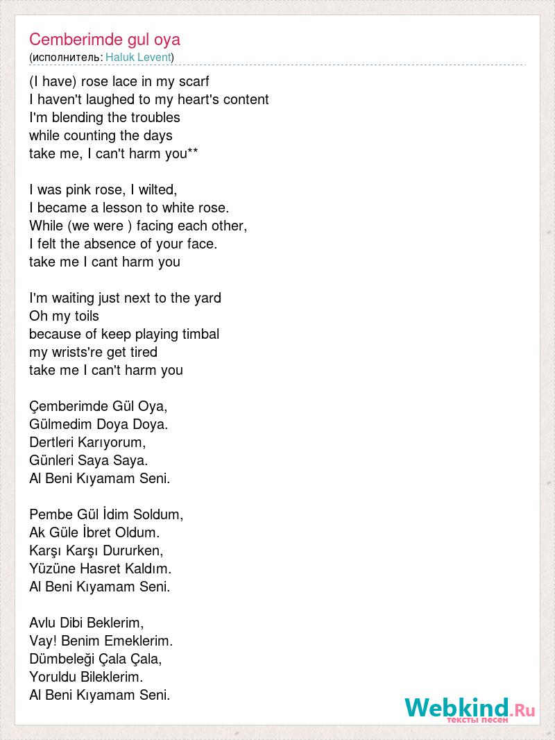 (I have) rose lace in my scarf I haven't laughed to my heart's content I'm blending the troubles while counting the days take me, I can't harm you** I was pink rose, I wilted, I became a lesson to white rose. While (we were ) facing each other, I felt the absence of your face. take me I cant harm you I'm waiting just next to the yard Oh my toils because of keep playing timbal my wrists're get tired take me I can't harm you Çemberimde Gül Oya, Gülmedim Doya Doya. Dertleri Karıyorum, Günleri Saya Saya. Al Beni Kıyamam Seni. Pembe Gül İdim Soldum, Ak Güle İbret Oldum. Karşı Karşı Dururken, Yüzüne Hasret Kaldım. Al Beni Kıyamam Seni. Avlu Dibi Beklerim, Vay! Benim Emeklerim. Dümbeleği Çala Çala, Yoruldu Bileklerim. Al Beni Kıyamam Seni.