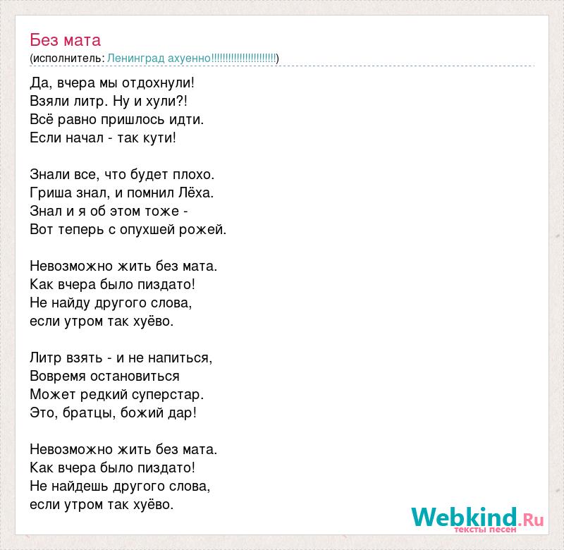 Да, вчера мы отдохнули! Взяли литр. Ну и хули?! Всё равно пришлось идти. Если начал - так кути! Знали все, что будет плохо. Гриша знал, и помнил Лёха. Знал и я об этом тоже - Вот теперь с опухшей рожей. Невозможно жить без мата. Как вчера было пиздато! Не найду другого слова, если утром так хуёво. Литр взять - и не напиться, Вовремя остановиться Может редкий суперстар. Это, братцы, божий дар! Невозможно жить без мата. Как вчера было пиздато! Не найдешь другого слова, если утром так хуёво.