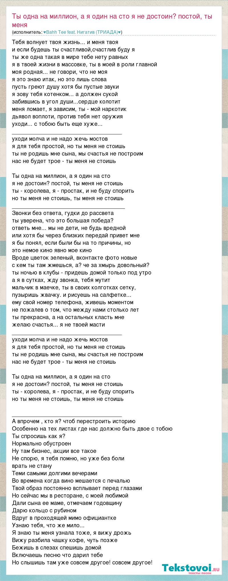 Главная→Исполнители→♥Bahh Tee feat. Нигатив (ТРИАДА)♥→Ты одна на миллион, а я один на сто я не достоин? постой, ты меня