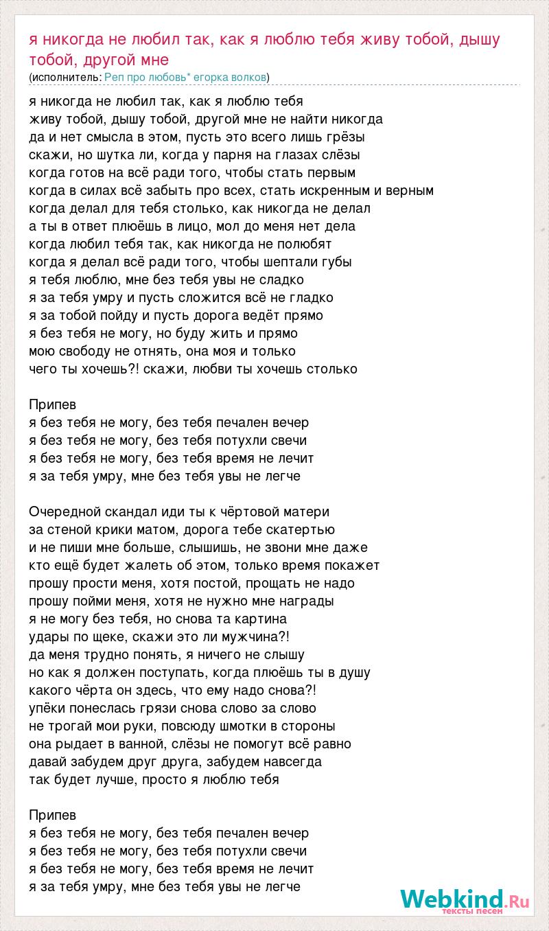 Главная→Исполнители→Реп про любовь* егорка волков→Я никогда не любил так, как я люблю тебя живу тобой, дышу тобой, другой