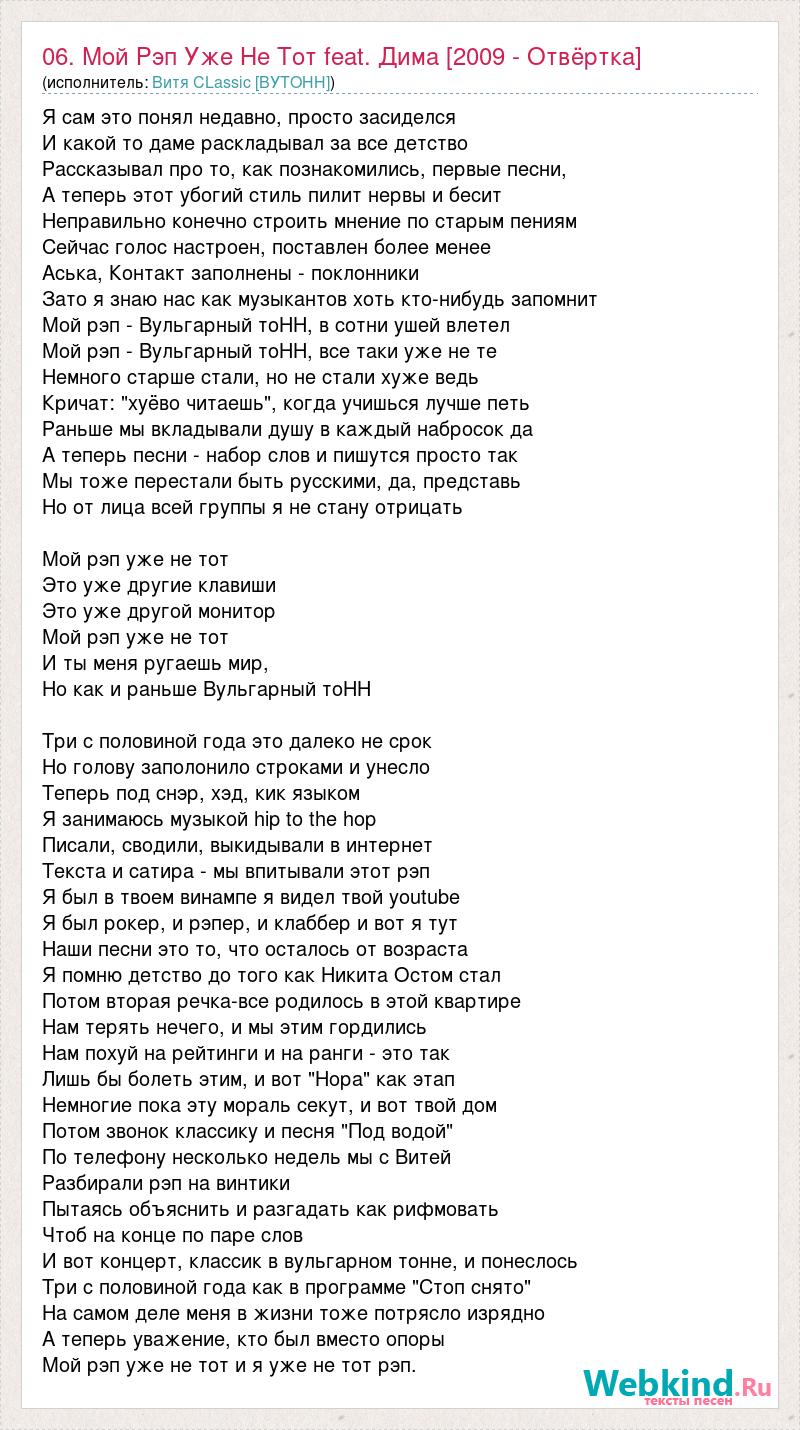 Я сам это понял недавно, просто засиделся И какой то даме раскладывал за все детство Рассказывал про то, как познакомились, первые песни, А теперь этот убогий стиль пилит нервы и бесит Неправильно конечно строить мнение по старым пениям Сейчас голос настроен, поставлен более менее Аська, Контакт заполнены - поклонники Зато я знаю нас как музыкантов хоть кто-нибудь запомнит Мой рэп - Вульгарный тоНН, в сотни ушей влетел Мой рэп - Вульгарный тоНН, все таки уже не те Немного старше стали, но не стали хуже ведь Кричат: "хуёво читаешь", когда учишься лучше петь Раньше мы вкладывали душу в каждый набросок да А теперь песни - набор слов и пишутся просто так Мы тоже перестали быть русскими, да, представь Но от лица всей группы я не стану отрицать Мой рэп уже не тот Это уже другие клавиши Это уже другой монитор Мой рэп уже не тот И ты меня ругаешь мир, Но как и раньше Вульгарный тоНН Три с половиной года это далеко не срок Но голову заполонило строками и унесло Теперь под снэр, хэд, кик языком Я занимаюсь музыкой hip to the hop Писали, сводили, выкидывали в интернет Текста и сатира - мы впитывали этот рэп Я был в твоем винампе я видел твой youtube Я был рокер, и рэпер, и клаббер и вот я тут Наши песни это то, что осталось от возраста Я помню детство до того как Никита Остом стал Потом вторая речка-все родилось в этой квартире Нам терять нечего, и мы этим гордились Нам похуй на рейтинги и на ранги - это так Лишь бы болеть этим, и вот "Нора" как этап Немногие пока эту мораль секут, и вот твой дом Потом звонок классику и песня "Под водой" По телефону несколько недель мы с Витей Разбирали рэп на винтики Пытаясь объяснить и разгадать как рифмовать Чтоб на конце по паре слов И вот концерт, классик в вульгарном тонне, и понеслось Три с половиной года как в программе "Стоп снято" На самом деле меня в жизни тоже потрясло изрядно А теперь уважение, кто был вместо опоры Мой рэп уже не тот и я уже не тот рэп.