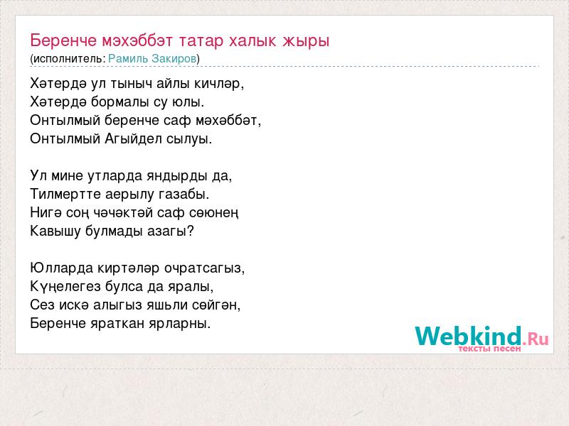 Хәтердә ул тыныч айлы кичләр, Хәтердә бормалы су юлы. Онтылмый беренче саф мәхәббәт, Онтылмый Агыйдел сылуы. Ул мине утларда яндырды да, Тилмертте аерылу газабы. Нигә соң чәчәктәй саф сөюнең Кавышу булмады азагы? Юлларда киртәләр очратсагыз, Күңелегез булса да яралы, Сез искә алыгыз яшьли сөйгән, Беренче яраткан ярларны.
