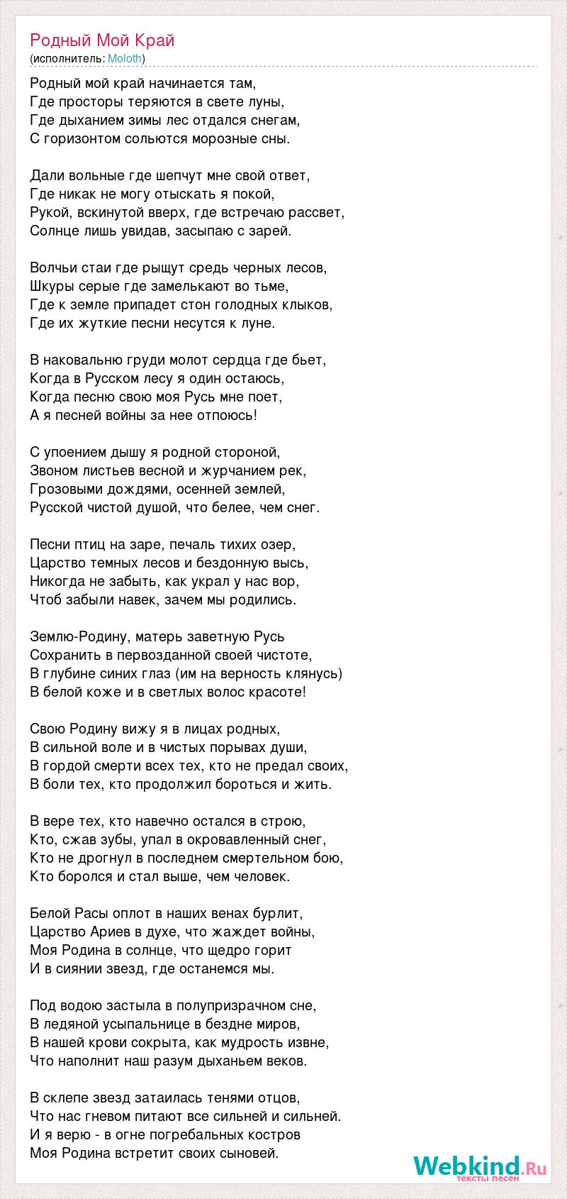 Родный мой край начинается там, Где просторы теряются в свете луны, Где дыханием зимы лес отдался снегам, С горизонтом сольются морозные сны. Дали вольные где шепчут мне свой ответ, Где никак не могу отыскать я покой, Рукой, вскинутой вверх, где встречаю рассвет, Солнце лишь увидав, засыпаю с зарей. Волчьи стаи где рыщут средь черных лесов, Шкуры серые где замелькают во тьме, Где к земле припадет стон голодных клыков, Где их жуткие песни несутся к луне. В наковальню груди молот сердца где бьет, Когда в Русском лесу я один остаюсь, Когда песню свою моя Русь мне поет, А я песней войны за нее отпоюсь! С упоением дышу я родной стороной, Звоном листьев весной и журчанием рек, Грозовыми дождями, осенней землей, Русской чистой душой, что белее, чем снег. Песни птиц на заре, печаль тихих озер, Царство темных лесов и бездонную высь, Никогда не забыть, как украл у нас вор, Чтоб забыли навек, зачем мы родились. Землю-Родину, матерь заветную Русь Сохранить в первозданной своей чистоте, В глубине синих глаз (им на верность клянусь) В белой коже и в светлых волос красоте! Свою Родину вижу я в лицах родных, В сильной воле и в чистых порывах души, В гордой смерти всех тех, кто не предал своих, В боли тех, кто продолжил бороться и жить. В вере тех, кто навечно остался в строю, Кто, сжав зубы, упал в окровавленный снег, Кто не дрогнул в последнем смертельном бою, Кто боролся и стал выше, чем человек. Белой Расы оплот в наших венах бурлит, Царство Ариев в духе, что жаждет войны, Моя Родина в солнце, что щедро горит И в сиянии звезд, где останемся мы. Под водою застыла в полупризрачном сне, В ледяной усыпальнице в бездне миров, В нашей крови сокрыта, как мудрость извне, Что наполнит наш разум дыханьем веков. В склепе звезд затаилась тенями отцов, Что нас гневом питают все сильней и сильней. И я верю - в огне погребальных костров Моя Родина встретит своих сыновей.