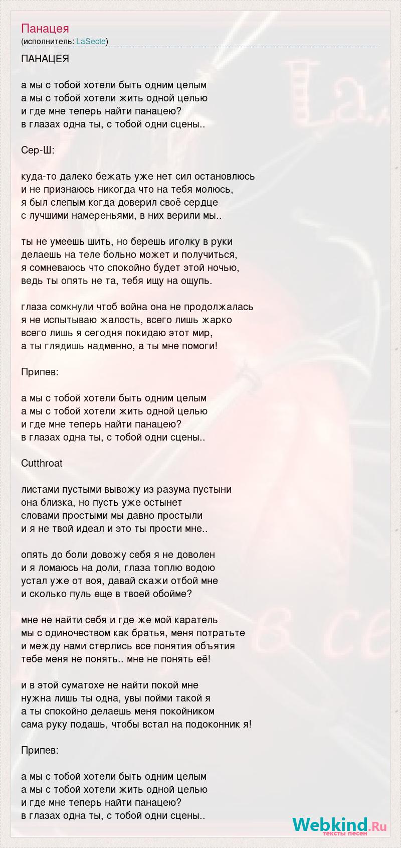 ПАНАЦЕЯ а мы с тобой хотели быть одним целым а мы с тобой хотели жить одной целью и где мне теперь найти панацею? в глазах одна ты, с тобой одни сцены.. Сер-Ш: куда-то далеко бежать уже нет сил остановлюсь и не признаюсь никогда что на тебя молюсь, я был слепым когда доверил своё сердце с лучшими намереньями, в них верили мы.. ты не умеешь шить, но берешь иголку в руки делаешь на теле больно может и получиться, я сомневаюсь что спокойно будет этой ночью, ведь ты опять не та, тебя ищу на ощупь. глаза сомкнули чтоб война она не продолжалась я не испытываю жалость, всего лишь жарко всего лишь я сегодня покидаю этот мир, а ты глядишь надменно, а ты мне помоги! Припев: а мы с тобой хотели быть одним целым а мы с тобой хотели жить одной целью и где мне теперь найти панацею? в глазах одна ты, с тобой одни сцены.. Cutthroat листами пустыми вывожу из разума пустыни она близка, но пусть уже остынет словами простыми мы давно простыли и я не твой идеал и это ты прости мне.. опять до боли довожу себя я не доволен и я ломаюсь на доли, глаза топлю водою устал уже от воя, давай скажи отбой мне и сколько пуль еще в твоей обойме? мне не найти себя и где же мой каратель мы с одиночеством как братья, меня потратьте и между нами стерлись все понятия объятия тебе меня не понять.. мне не понять её! и в этой суматохе не найти покой мне нужна лишь ты одна, увы пойми такой я а ты спокойно делаешь меня покойником сама руку подашь, чтобы встал на подоконник я! Припев: а мы с тобой хотели быть одним целым а мы с тобой хотели жить одной целью и где мне теперь найти панацею? в глазах одна ты, с тобой одни сцены..
