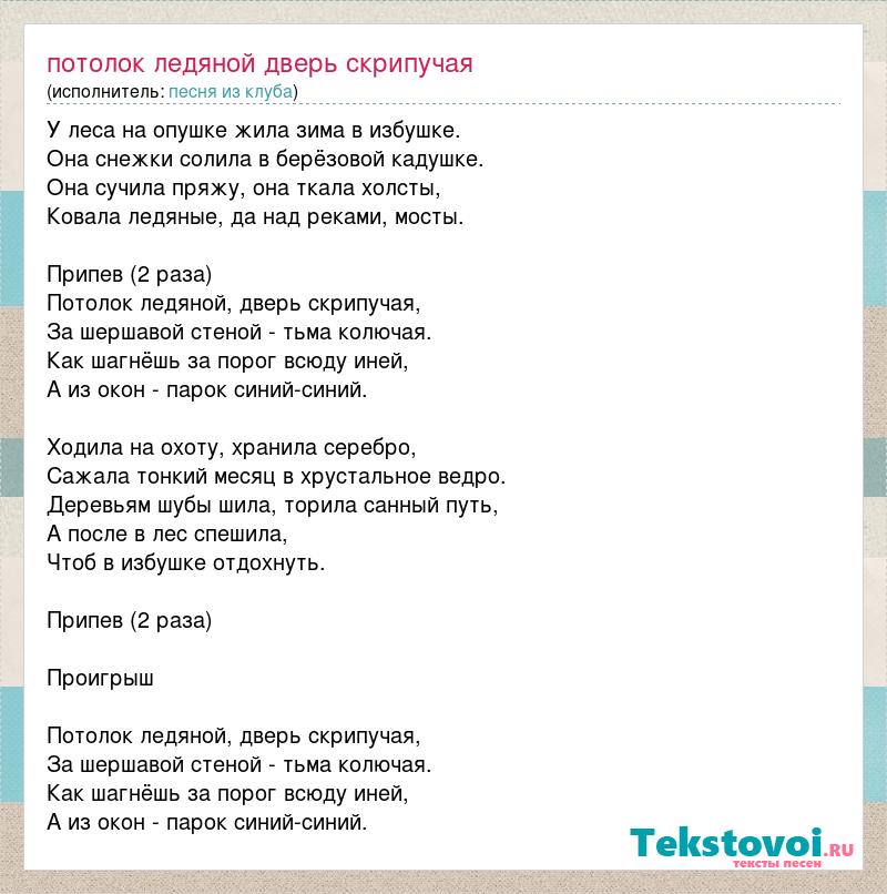 У леса на опушке жила зима в избушке. Она снежки солила в берёзовой кадушке. Она сучила пряжу, она ткала холсты, Ковала ледяные, да над реками, мосты. Припев (2 раза) Потолок ледяной, дверь скрипучая, За шершавой стеной - тьма колючая. Как шагнёшь за порог всюду иней, А из окон - парок синий-синий. Ходила на охоту, хранила серебро, Сажала тонкий месяц в хрустальное ведро. Деревьям шубы шила, торила санный путь, А после в лес спешила, Чтоб в избушке отдохнуть. Припев (2 раза) Проигрыш Потолок ледяной, дверь скрипучая, За шершавой стеной - тьма колючая. Как шагнёшь за порог всюду иней, А из окон - парок синий-синий.