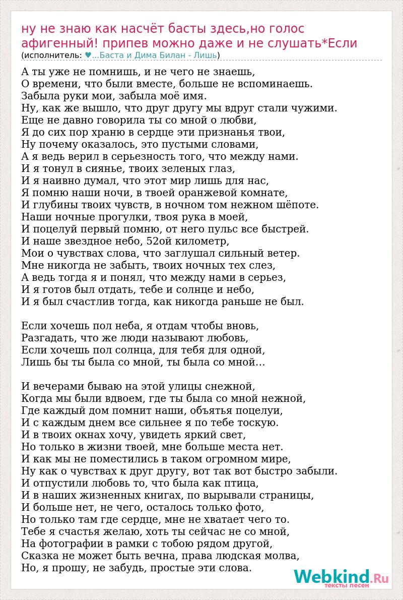 А ты уже не помнишь, и не чего не знаешь, О времени, что были вместе, больше не вспоминаешь. Забыла руки мои, забыла моё имя. Ну, как же вышло, что друг другу мы вдруг стали чужими. Еще не давно говорила ты со мной о любви, Я до сих пор храню в сердце эти признанья твои, Ну почему оказалось, это пустыми словами, А я ведь верил в серьезность того, что между нами. И я тонул в сиянье, твоих зеленых глаз, И я наивно думал, что этот мир лишь для нас, Я помню наши ночи, в твоей оранжевой комнате, И глубины твоих чувств, в ночном том нежном шёпоте. Наши ночные прогулки, твоя рука в моей, И поцелуй первый помню, от него пульс все быстрей. И наше звездное небо, 52ой километр, Мои о чувствах слова, что заглушал сильный ветер. Мне никогда не забыть, твоих ночных тех слез, А ведь тогда я и понял, что между нами в серьез, И я готов был отдать, тебе и солнце и небо, И я был счастлив тогда, как никогда раньше не был. Если хочешь пол неба, я отдам чтобы вновь, Разгадать, что же люди называют любовь, Если хочешь пол солнца, для тебя для одной, Лишь бы ты была со мной, ты была со мной… И вечерами бываю на этой улицы снежной, Когда мы были вдвоем, где ты была со мной нежной, Где каждый дом помнит наши, объятья поцелуи, И с каждым днем все сильнее я по тебе тоскую. И в твоих окнах хочу, увидеть яркий свет, Но только в жизни твоей, мне больше места нет. И как мы не поместились в таком огромном мире, Ну как о чувствах к друг другу, вот так вот быстро забыли. И отпустили любовь то, что была как птица, И в наших жизненных книгах, по вырывали страницы, И больше нет, не чего, осталось только фото, Но только там где сердце, мне не хватает чего то. Тебе я счастья желаю, хоть ты сейчас не со мной, На фотографии в рамки с тобою рядом другой, Сказка не может быть вечна, права людская молва, Но, я прошу, не забудь, простые эти слова.